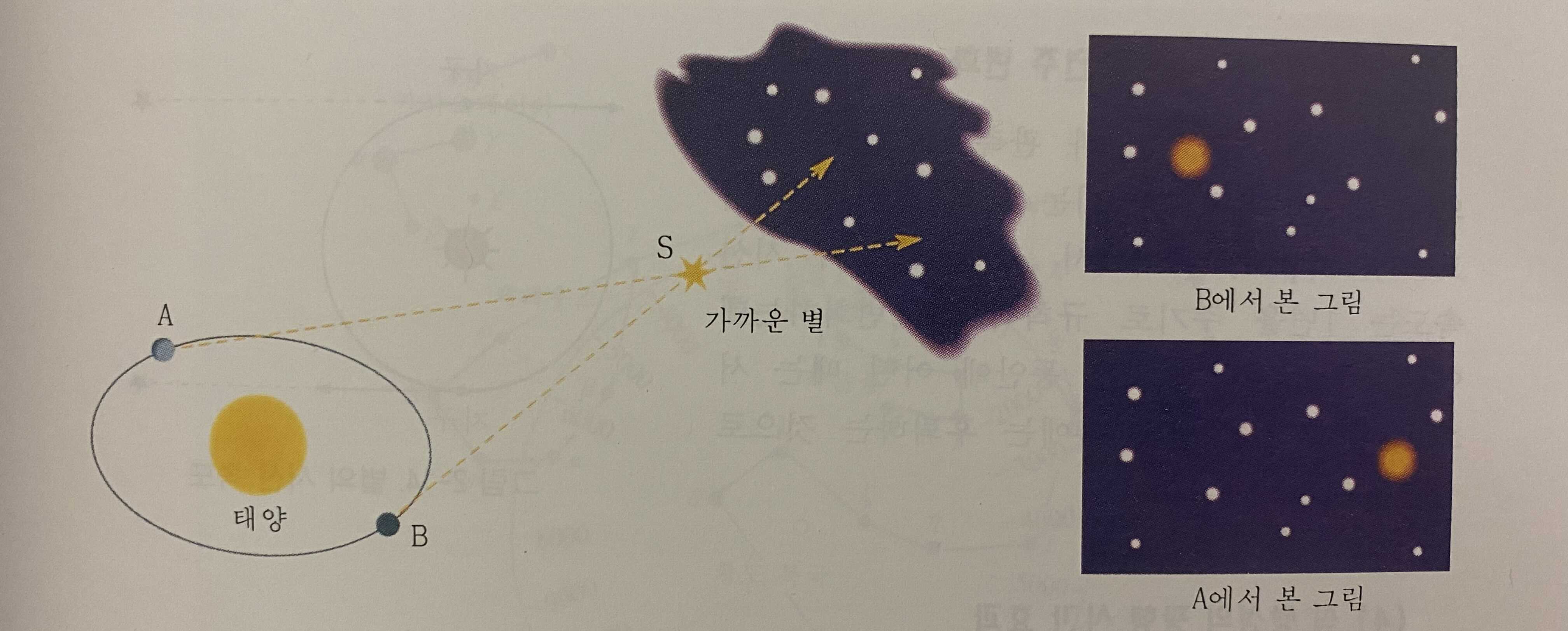 연주시차는연주 시차는 1838년 베셀에 의해서 처음 측정되었으며, 별의 연주 시차는 극히 작은 각도로 0.76"을 넘지 않는 것이 특징입니다. 이러한 연주 시차는 설명하자면, 아래의 그림을 통해 알 수 있습니다. 지구가 태양 둘레의 궤도에서 A에 있을 때 별 S는 A'의 방향에 보이고, 약 6개월 후에 B에 있을 때 별 S는 B'의 방향에 보이게 됩니다. 이때 별 S가 보이는 위치는 배경의 먼 별들에 대해서 1년을 주기로 타원을 그리는 것을 알 수 있는데 이 타원의 장반경에 해당하는 각도를 별 S의 연주 시차라고 합니다. 이러한 연주 시차는 바로 지구가 태양 둘레를 공전하기 때문에 일어나기 때문에 지구 공전의 증거로 들 수 있습니다.