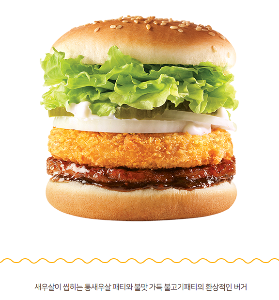 또 하나의 베스트 메뉴는 바로 새우버거! 치킨을 별로 좋아하지 않는 분들이 시키기 좋은 메뉴예요. 호불호가 잘 없는 통새우살, 불고기 패티라 무난하게 즐길 수 있는 버거겠죠.