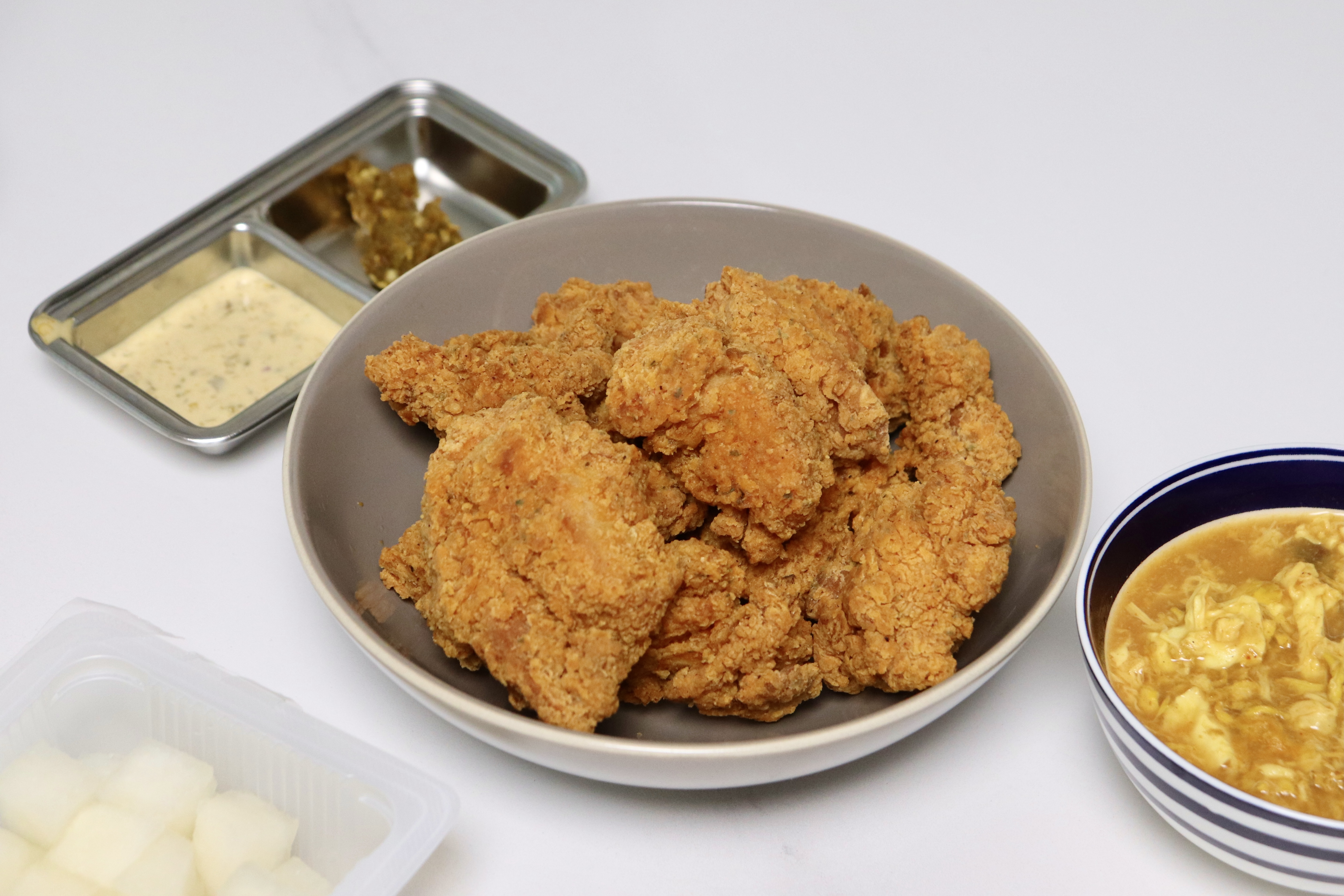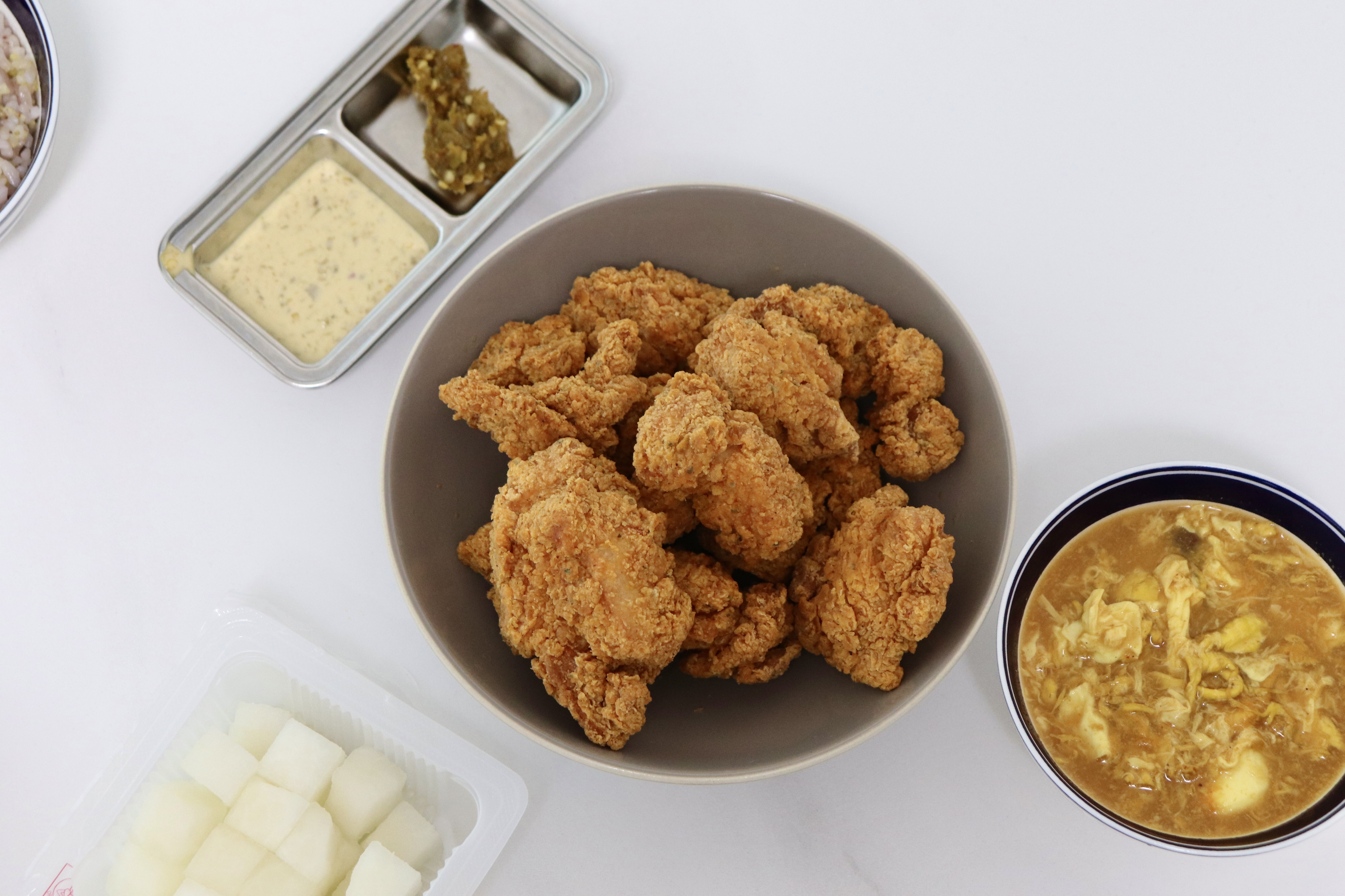 집에 있던 치킨무와 소스들 꺼내보았어요. 치킨을 찍어먹으면 좋겠다 싶어서 계란 카레도 급히 만들어보았는데요. 아무래도 간이 되어있다 보니 카레를 찍어먹기에는 조금 부담스럽긴 하더라고요.