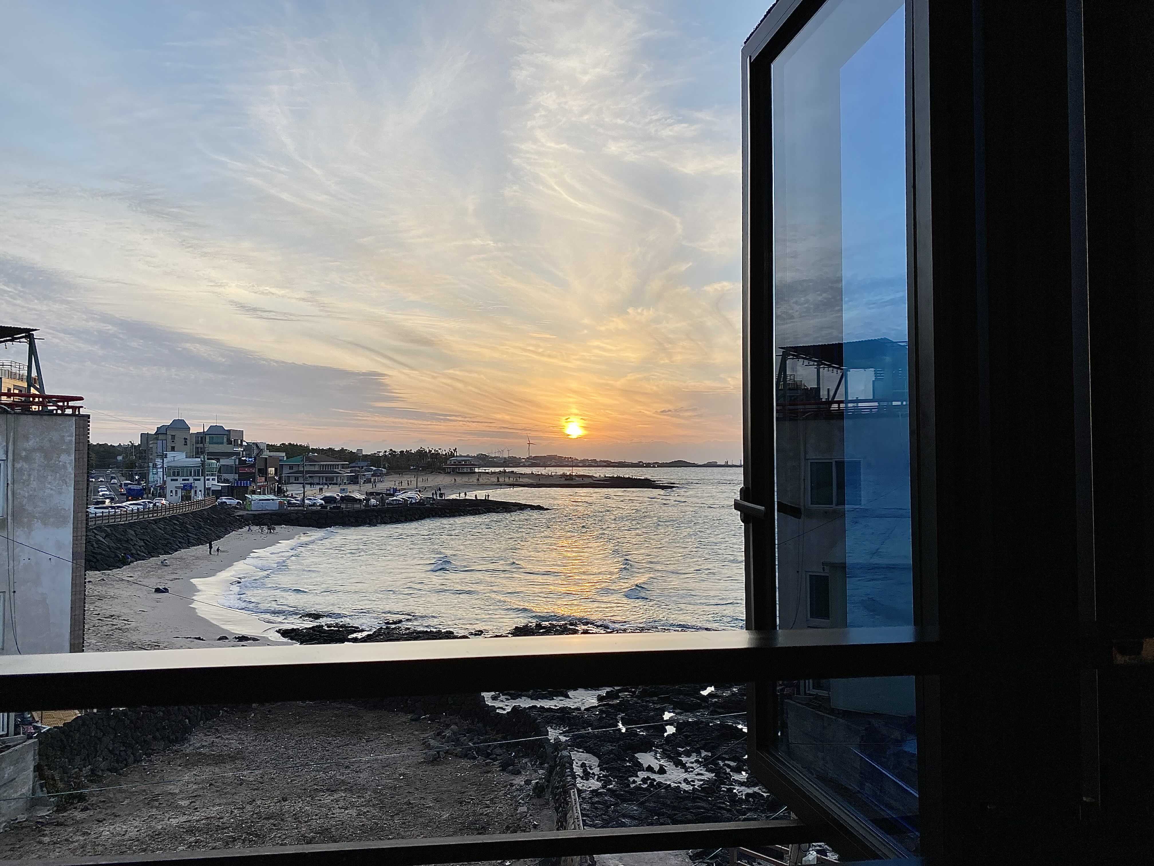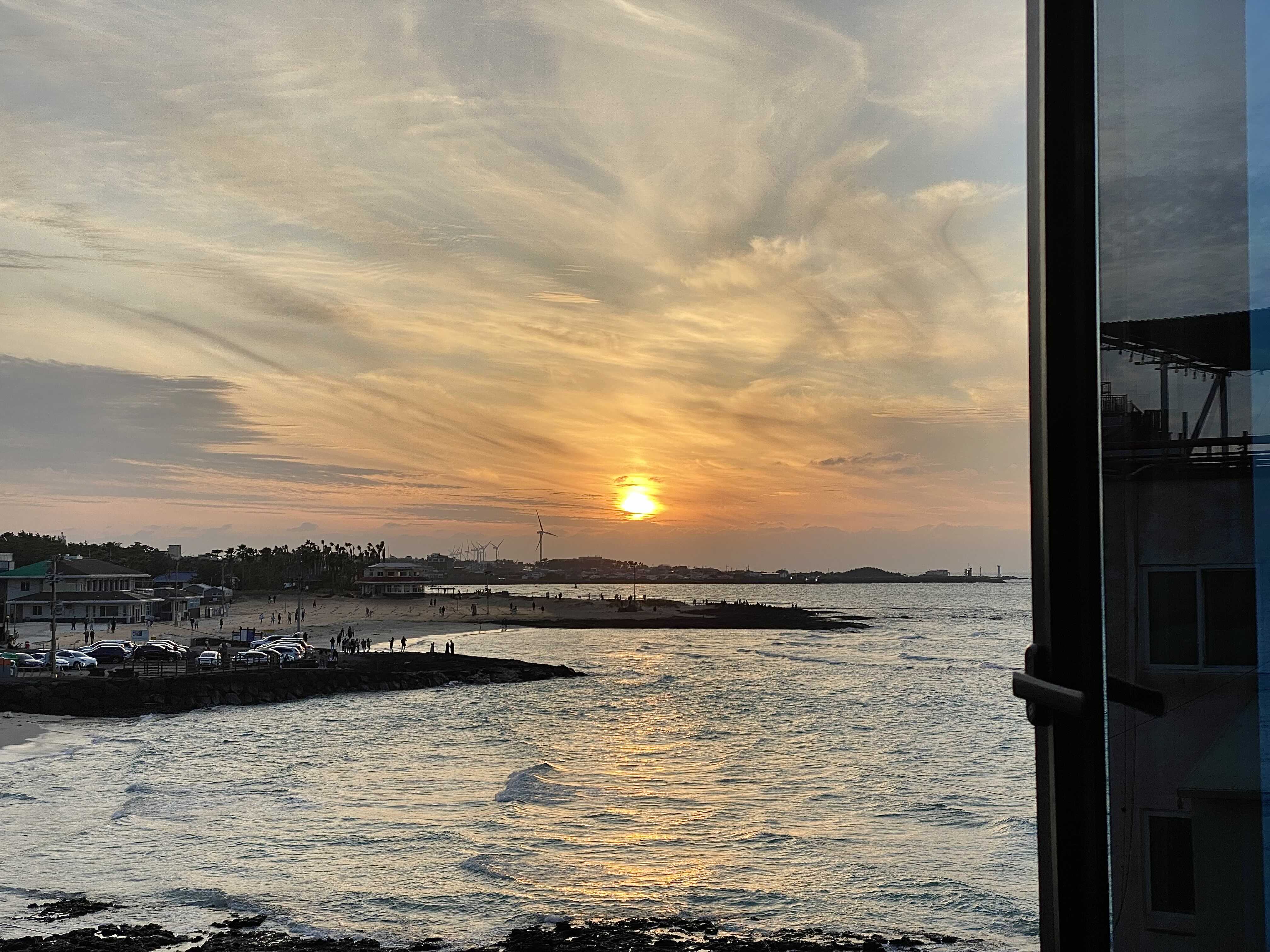 이렇게 노을을 감상할 수 있다는건데요. 운 좋게 창가 자리에 앉으셨다면 이렇게 멋진 협재 해수욕장의 풍경을 마주할 수 있답니다.