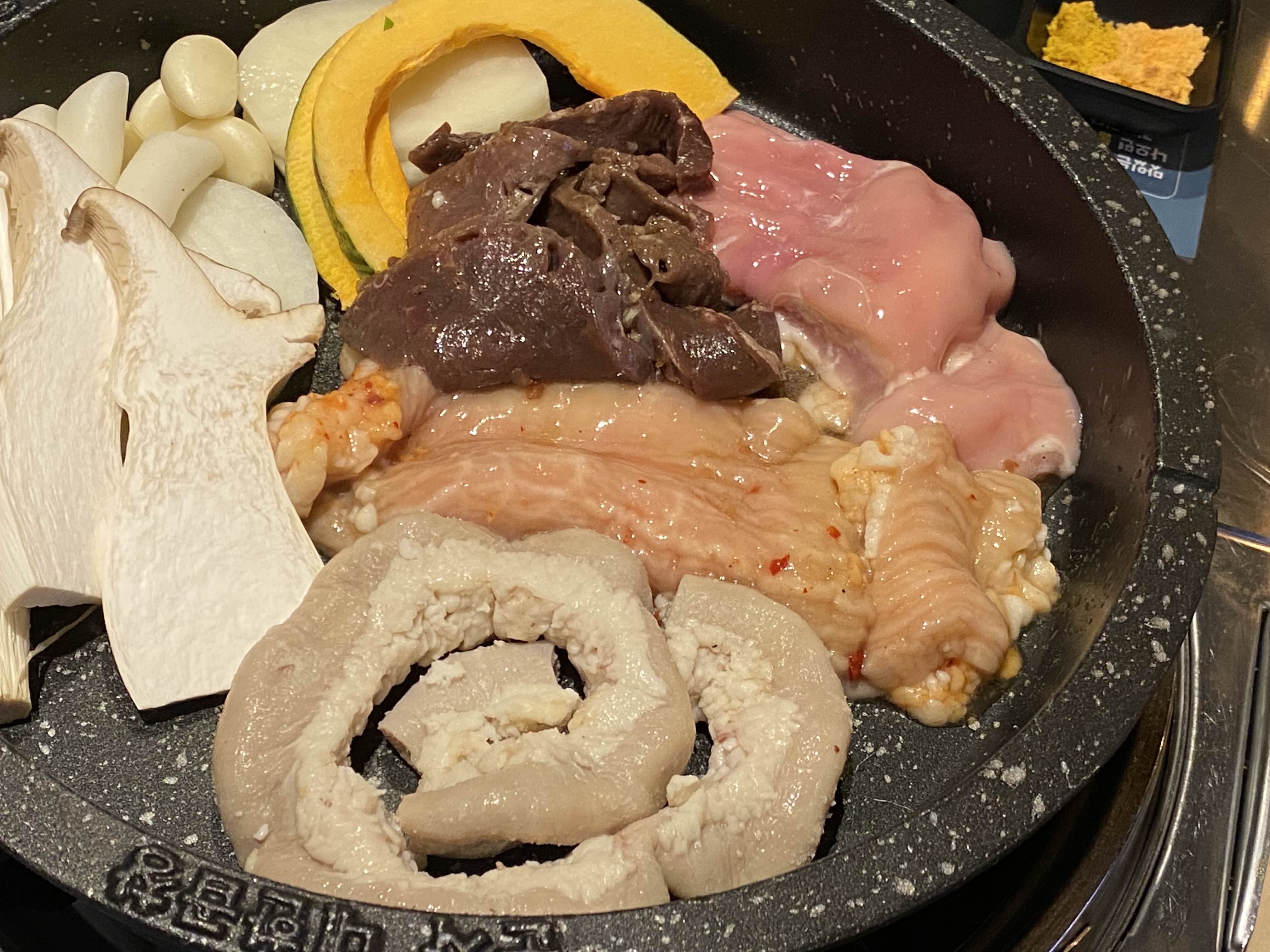 시켜본건 모듬곱창 2인분이에요. 염통과 함께 대창, 곱창 등 다양하게 있어서 먹기 좋겠더라고요. 버섯과 감자, 단호박도 있어서 다양한 맛들을 즐길 수 있었답니다.