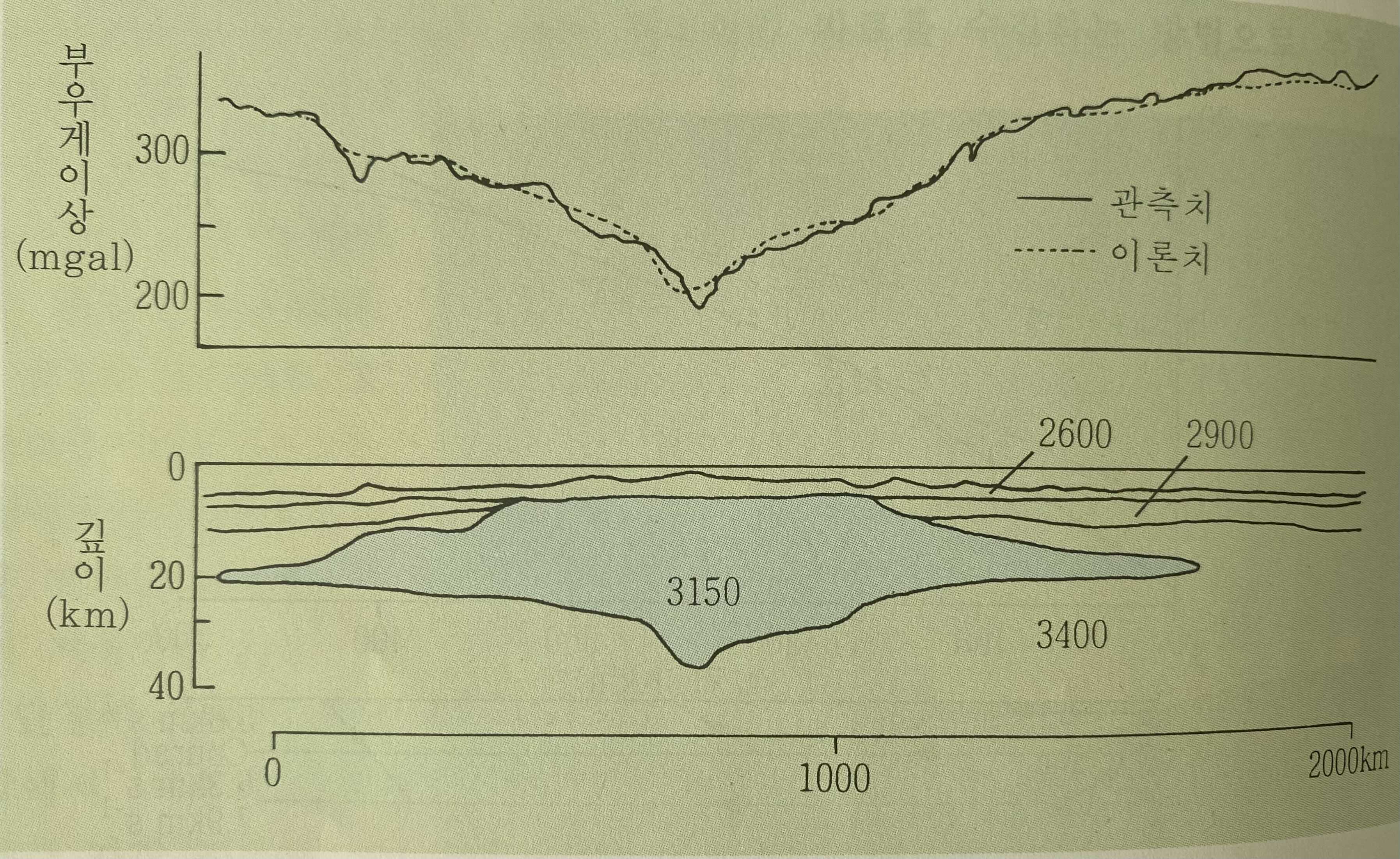중력측정에 의해 구해지는 부게이상은 지하에 밀도가 균질한 암석이 분포할 경우 0에 가까운 값을 가지나 주위보다 밀도가 낮은 암석이 분포할 경우 -의 값, 밀도가 높은 암석이 분포할 경우 +의 값을 나타냅니다. 지각을 구성하는 암석은 다양하고, 종류에 따라 암석의 밀도도 다릅니다. 따라서 부게이상의 값을 통해 지하 암석의 밀도분포를 알 수 있습니다. 이를 통해 지하구조에 대한 중요한 정보들도 제공받을 수 있습니다. 특히 광범위한 지역에 대한 중력측정을 통해 부게이상을 구할 경우 모호면 상부의 대륙지각과 해양지각의 구조를 규명할 수 있습니다. 일반적으로 대륙지각이나 해령 및 해구 부근에서는 주위에 비해 - 값을 나타냅니다. 따라서 지진파 연구를 통해 구한 자료와 지질학적인 지식을 함께 적용하여 지각 내부의 암석의 밀도분포에 대한 모델을 세우고 이로부터 구한 이론적인 중력이상값과 실측치와 비교하여 그 차이를 최소화하는 과정을 통해 지각의 구조를 규명할 수 있습니다. 대륙이나 해양에서의 지각균형은 주로 지각의 두께변화에 의해 이루어지고 있기 때문에 습곡산맥지대는 두꺼운 지각을 형성하고 있습니다. 반면 해령과 대륙의 융기지역(동아프리카, 미국서부)은 상부맨틀 상부에 저밀도 암석이 존재함으로써 지각균형 상태를 유지하고 있습니다. 중력측정을 통해서 부게이상, 지각균형이상을 구하고 탄성파 자료를 함께 이용하면 광범위한 지역에 걸친 지각구조 뿐만 아니라 지각평형상태까지 알 수 있습니다.