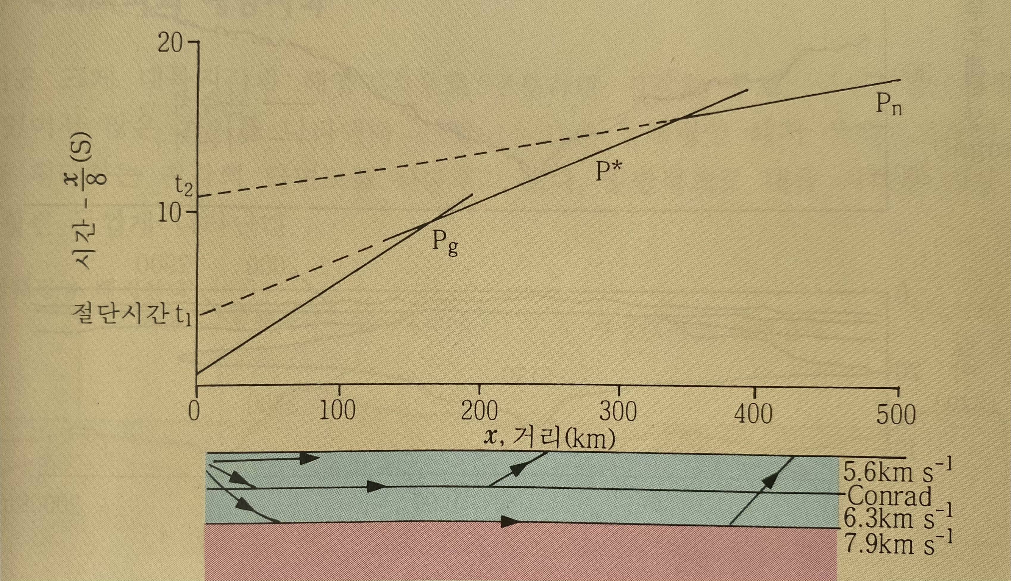 대륙지각의 구조에 대한 대부분은 1950년대 이후 발파지진학(explosion seismology)에 의해 얻어졌습니다. 자연지진보다 인공발파를 이용하는 이점은 발파시간과 발파점의 위치가 정확하게 알려지므로 지진이 일어나지 않은 지역에 대해서도 큰 어려움 없이 실시될 수 있단는 장점이 있습니다. 지각의 층과 두께를 조사하는 발파지진학에서 가장 많이 이용되는 방법은 굴절탄성파 탐사방법입니다. 이 방법은 발파점과 조사깊이의 수배에 이르는 측선(profile)을 따라 P파의 도착시간을 측정하여 주시곡선을 작성합니다. 실제로 대륙지각의 구조를 결정하기 위한 탄성파의 측선거리는 약 200~300km가 필요합니다. 아래의 그림은 발파점으로부터 직접 전파되는 파, 콘라드불연속면에서 임계굴절 해가는 파와 모호면에서 임계굴절해 가는 파의 거리에 따른 주시곡선을 나타냅니다. 이 주시곡선들의 기울기에서 상부 및 하부지각과 맨틀 상부에서의 탄성파 속도를 구할 수 있으며, 상부 및 하부지각의 두께는 각 층에서의 지진파 속도와 절단시간을 통해 구할 수 있습니다. 또한 탄성파가 반사되는 성질을 이용한 탄성파 반사법도 탐사기술의 발전으로 지각의 미세구조의 규명에 이르기까지 많이 활용되고 있습니다. 이러한 탄성파 굴절 및 반사법은 대륙지각 뿐만 아니라 해양지각의 구조 규명에도 많은 기여를 하고 있습니다.