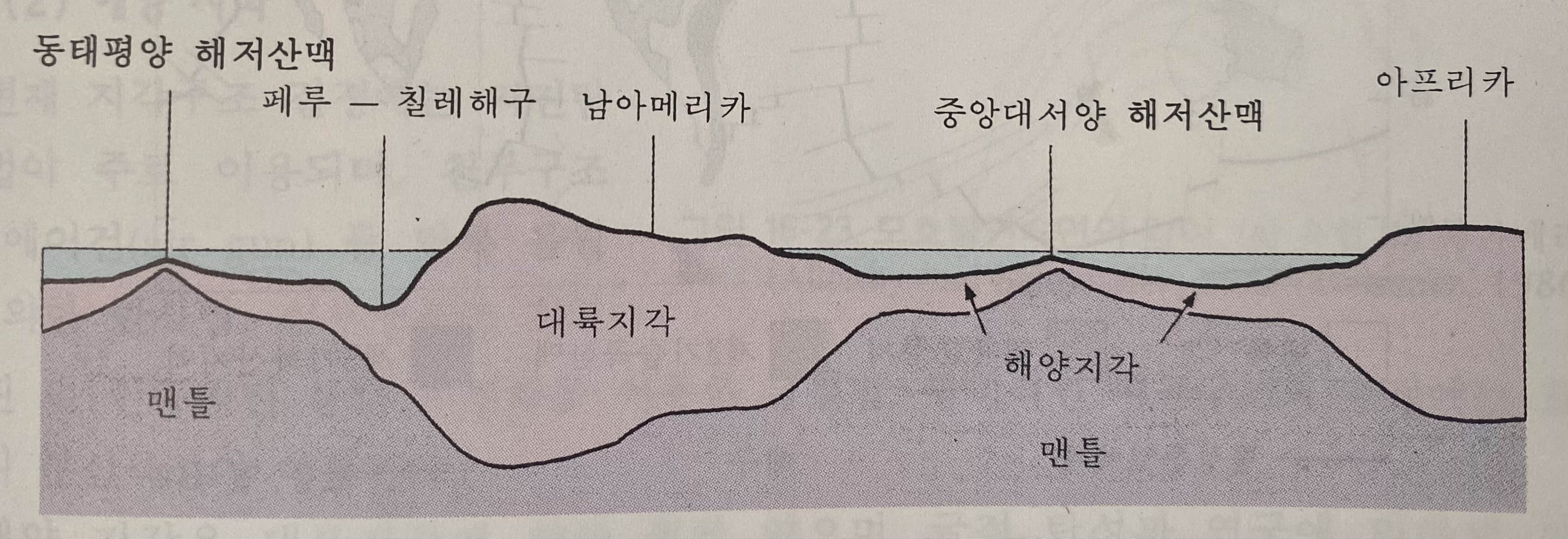 지각은 크게 대륙지각과 해양지각으로 나눌 수 있습니다. 이러한 대륙지각과 해양지각은 지각의 구조, 구성물질, 생성연대 등 많은 차이를 보입니다. 아래의 그림은 동태평양 해저 산맥으로부터 아프리카를 횡단하는 지각의 단면도를 나타내고 있습니다. 일반적으로 해양지각에 비해 대륙지각이 더 두껍게 나타나는 것이 특징입니다.
