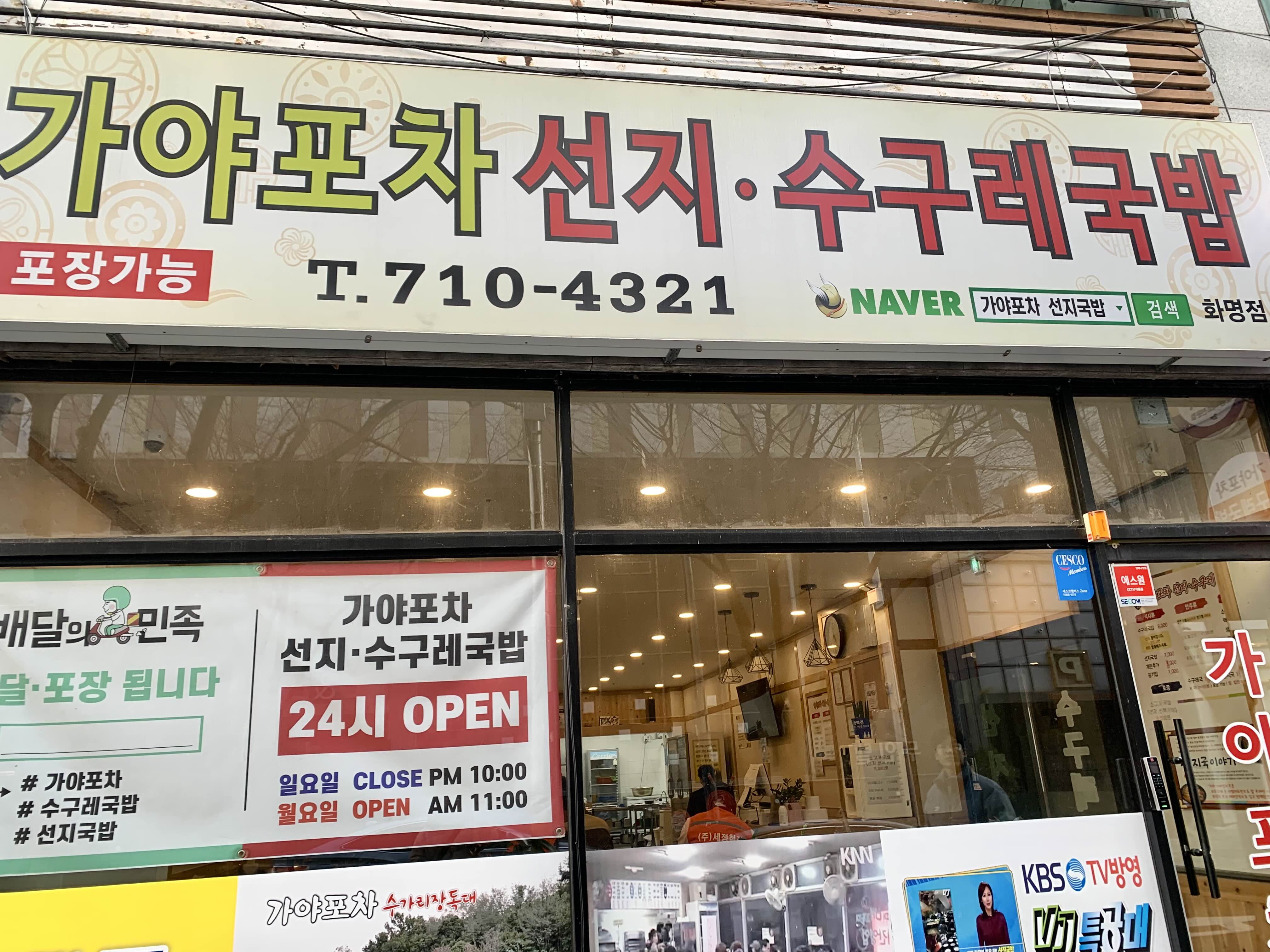 안녕하세요. 오늘은 수구레 국밥이 맛있었던 부산 화명동 가야포차 소개해드리려고 합니다. 24시간 오픈에 배달까지 되는 곳이라 (일요일은 저녁 10시 문 닫음, 월요일 오전 11시 오픈) 언제든 즐길 수 있었는데요. 방송에도 나온 적이 있더라고요. 그럼 자세히 보여드릴게요.