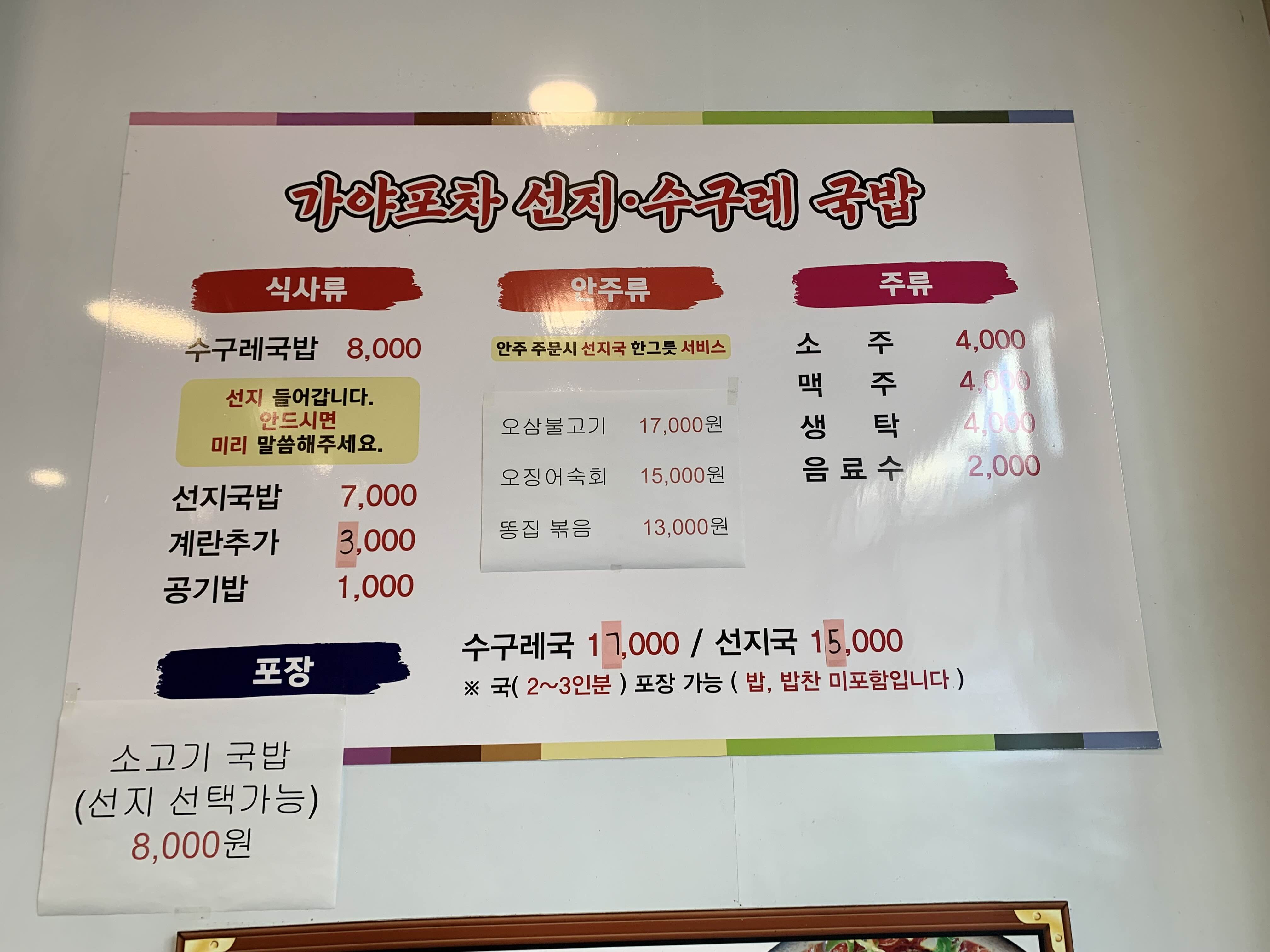 가야포차 선지 수구레 국밥에는 식사류와 안주류, 주류를 판매하고 있었어요. 수구레국과 선지국은 포장도 된답니다.