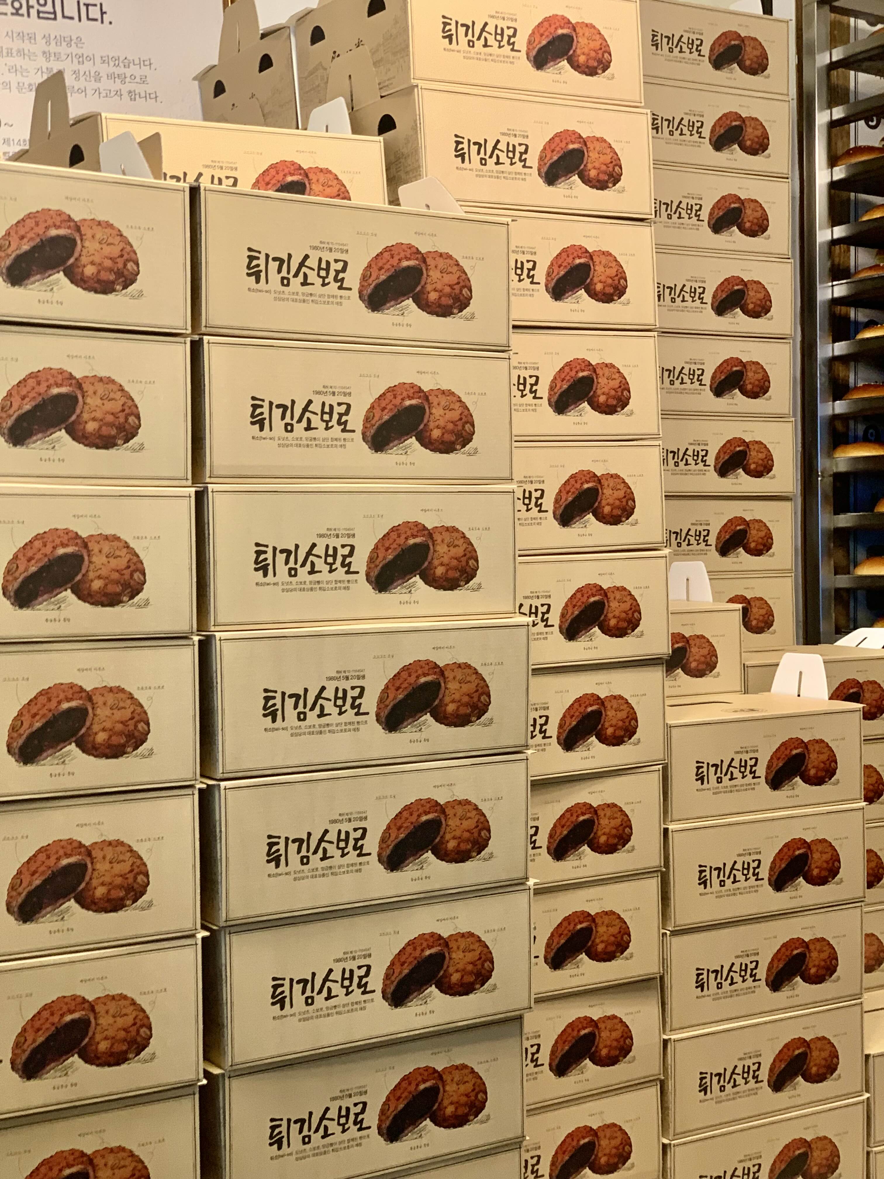 튀김소보로는 별도로 선물세트처럼 판매하고 있었는데요. 빵 코너 옆에 따로 위치하고 있어 이것만 사는 분들은 조금 더 빠르게 구입 가능해요. 튀김소보로와 부추빵, 튀김소보로, 튀소구마, 튀소초코까지 있는데 다양한 구성이 있었답니다.