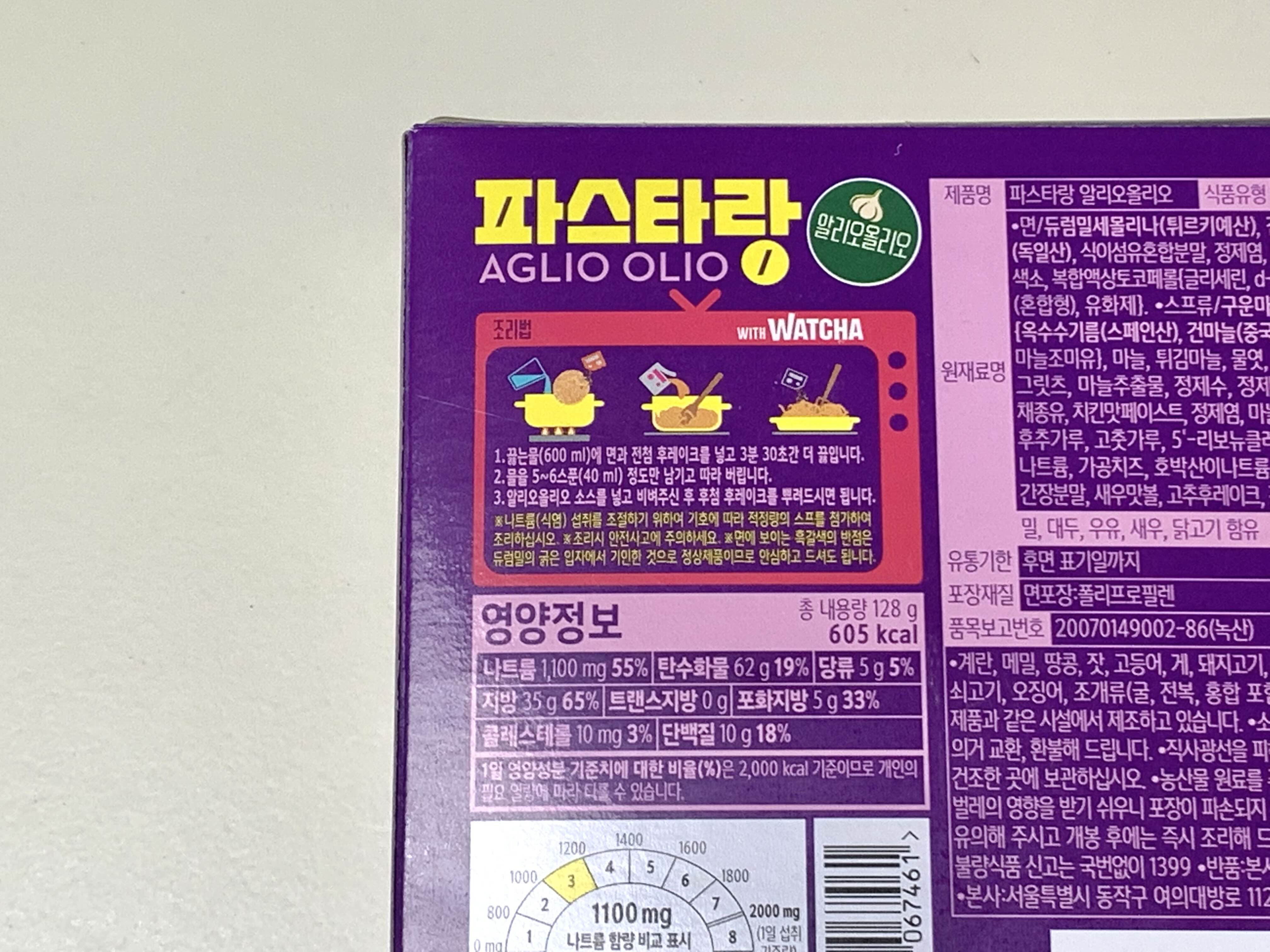 영양정보를 살펴보면 총 내용량 128g에 칼로리가 605kcal에요. 나트륨이 조금 높은 편이기 때문에 조절하실 분들은 기호에 따라 적정량의 스프를 첨가해 주시면 좋겠죠.
