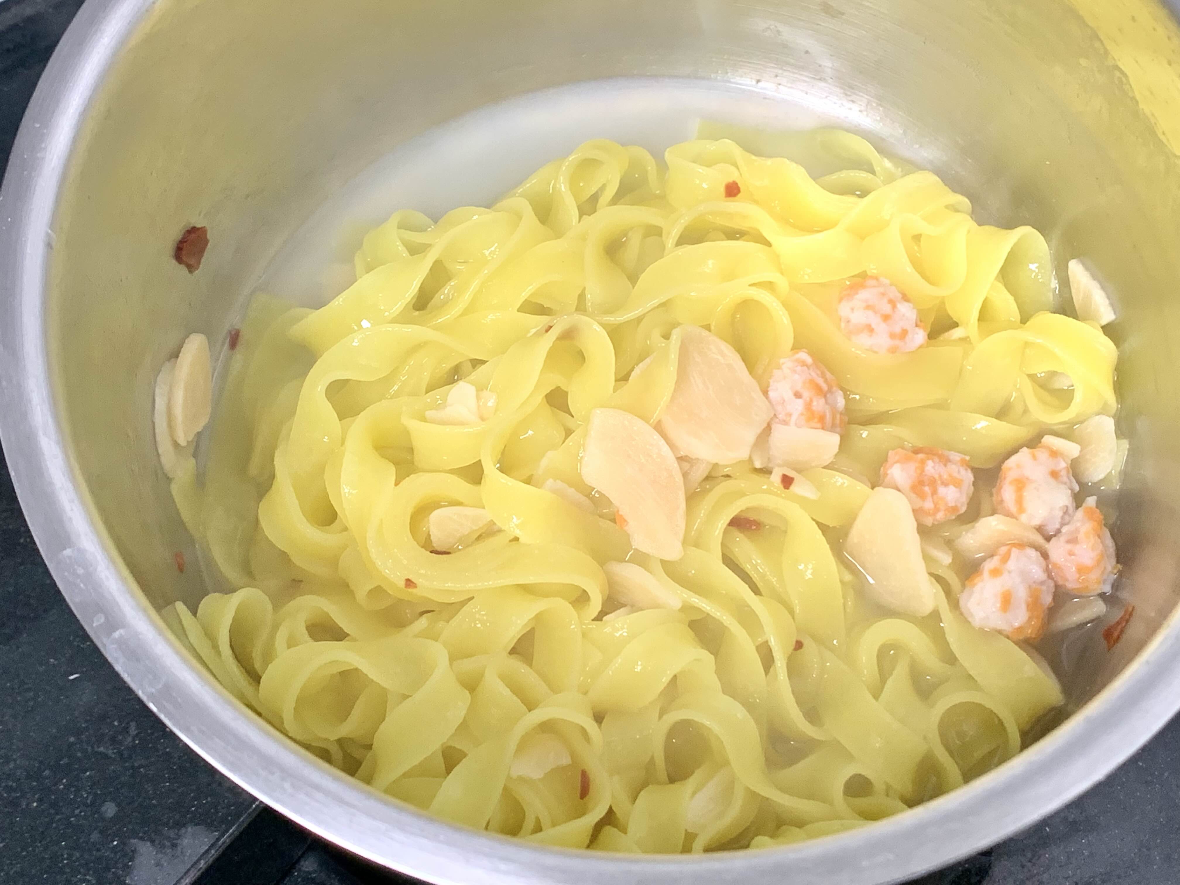 끓는물 600ml에 면과 전첨 후레이크를 넣고 3분 30초간 더 끓여주세요. 끓는 물 5~6스푼 정도만 남기고 따라 버려 주세요. 알리오올리오 소스를 넣고 비벼주신 후 후첨후레이크를 뿌려드시면 끝이랍니다.