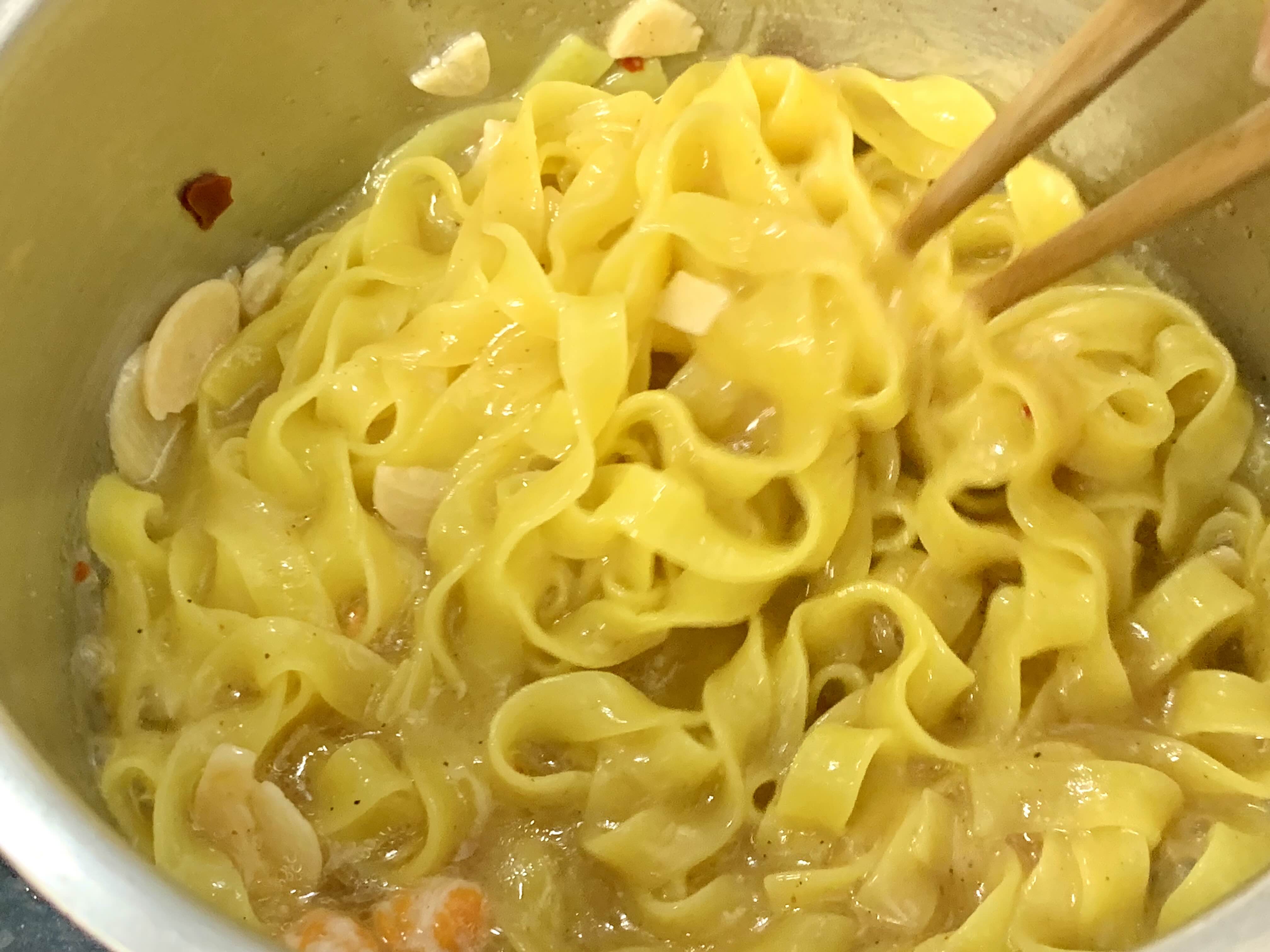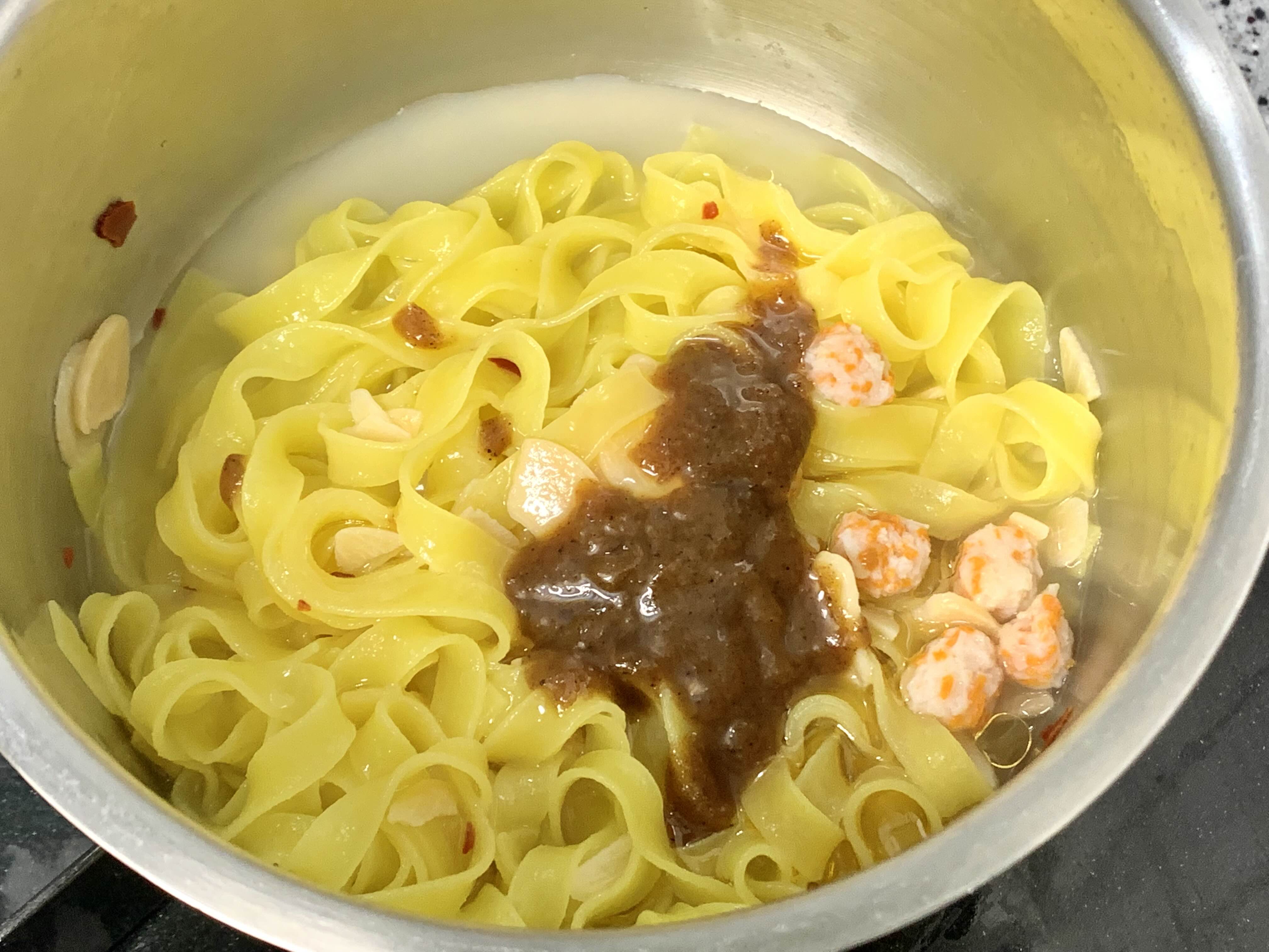 끓는물 600ml에 면과 전첨 후레이크를 넣고 3분 30초간 더 끓여주세요. 끓는 물 5~6스푼 정도만 남기고 따라 버려 주세요. 알리오올리오 소스를 넣고 비벼주신 후 후첨후레이크를 뿌려드시면 끝이랍니다.