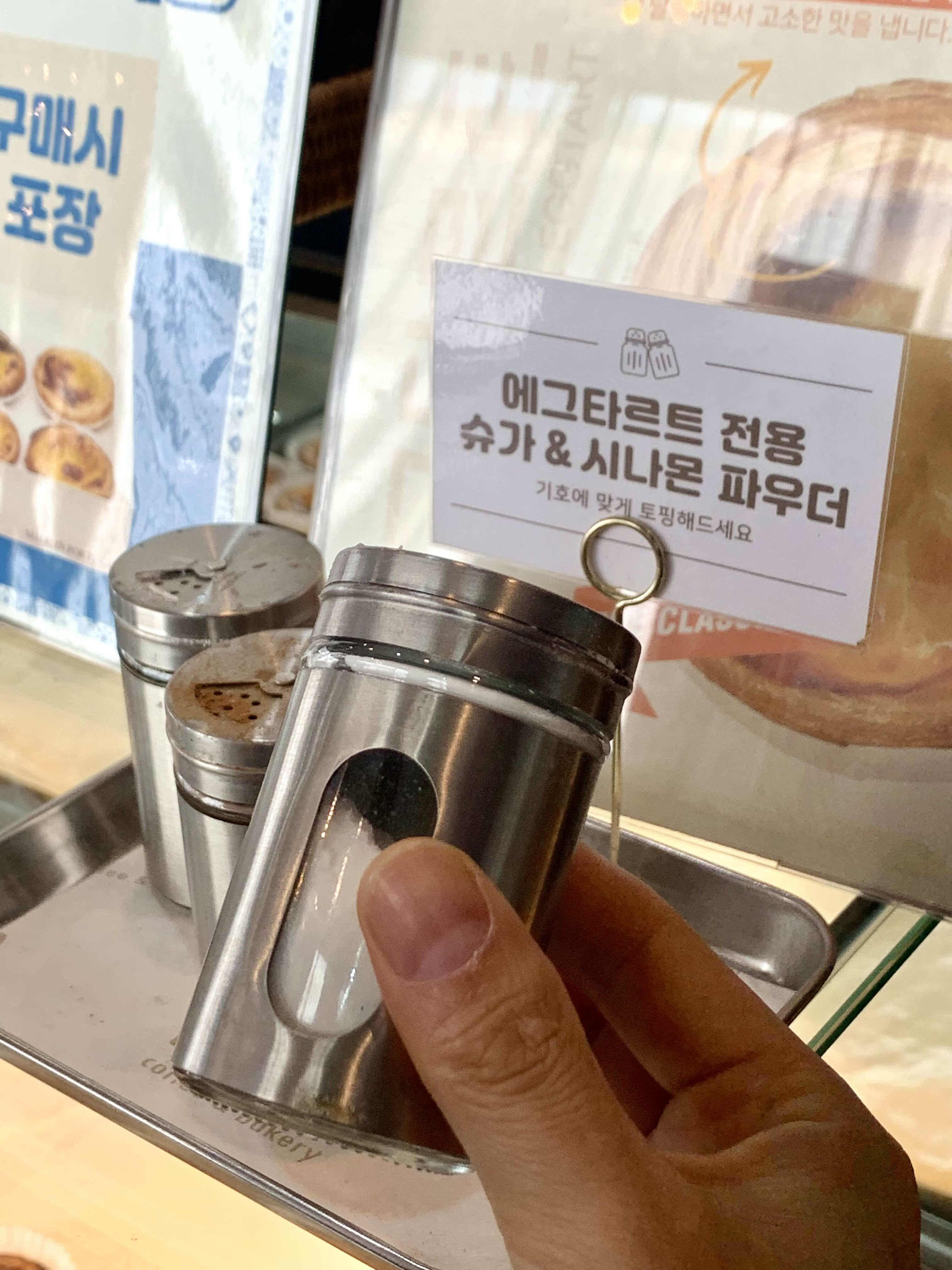 에그타르트 전용 슈가&시나몬 파우더도 있어서 기호에 맞게 토핑을 해서 먹을 수도 있어요.