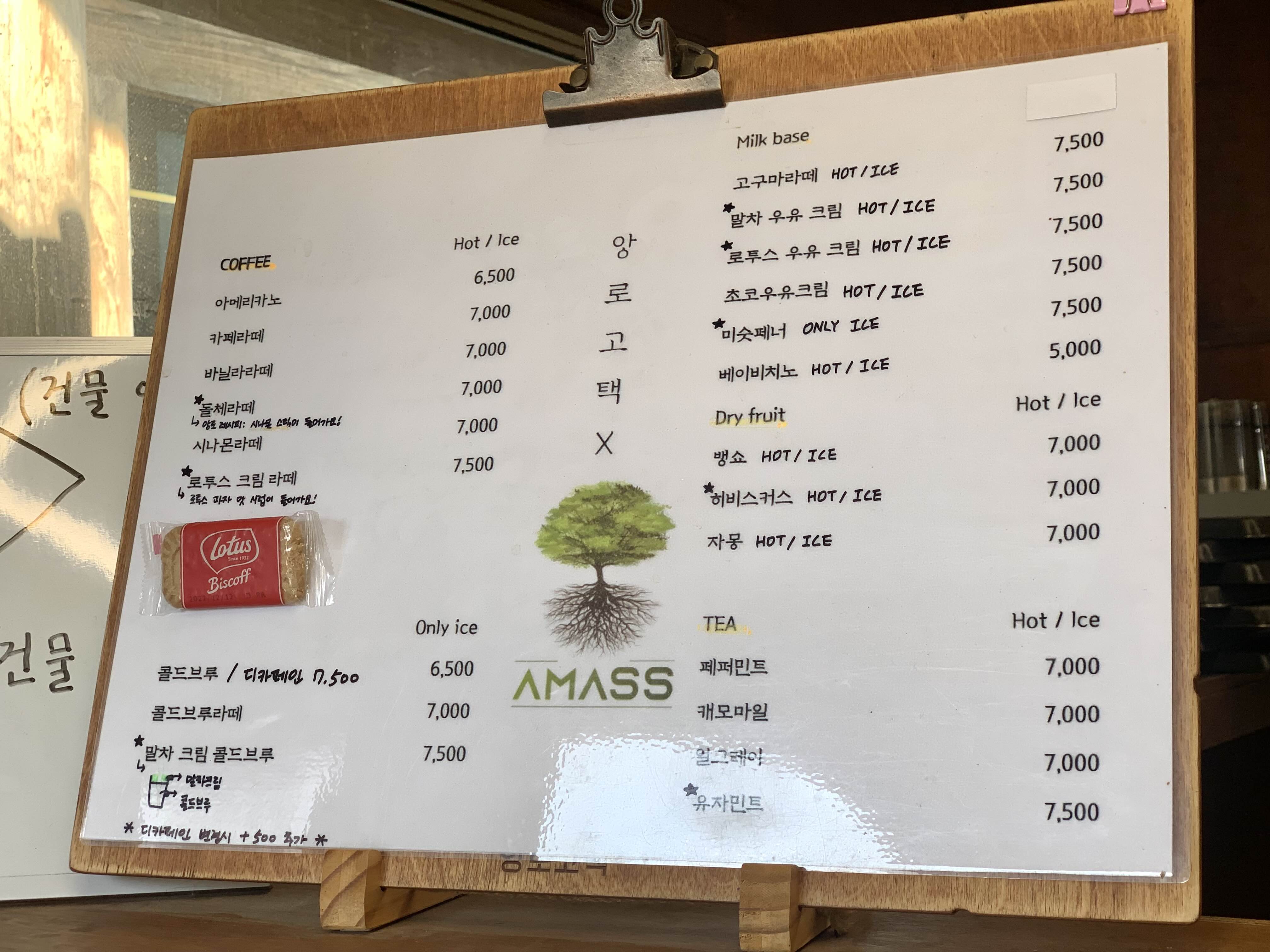 메뉴도 다양한편! 이날은 로투스 크림 라떼와 시나몬라떼 시켜보았어요~! 디카페인 변경 시에는 500원 추가예요!