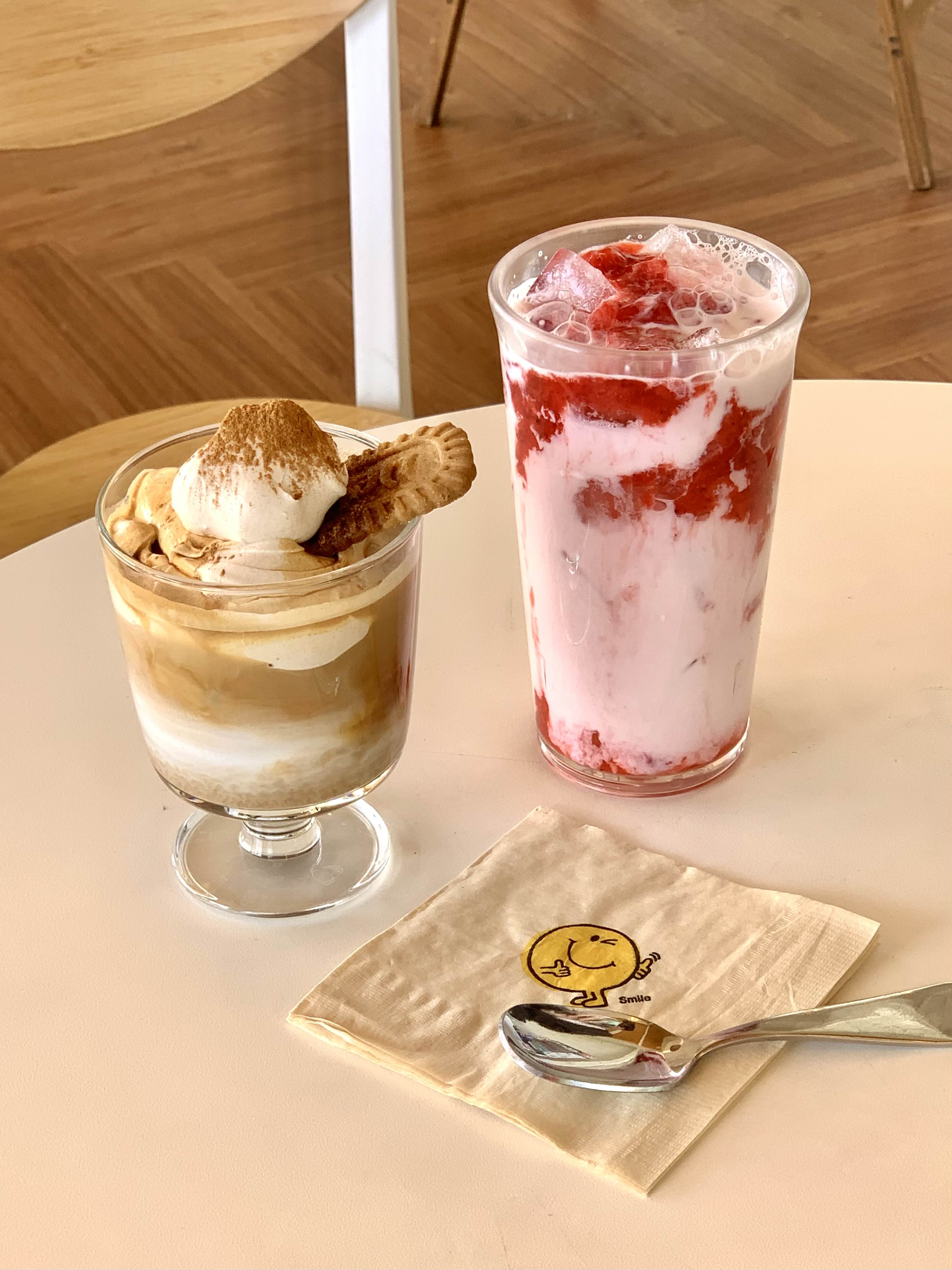 기다리고 있으니 나온 메뉴들! 시나몬크림라떼와 수제청 딸기라떼로 시켜보았어요!