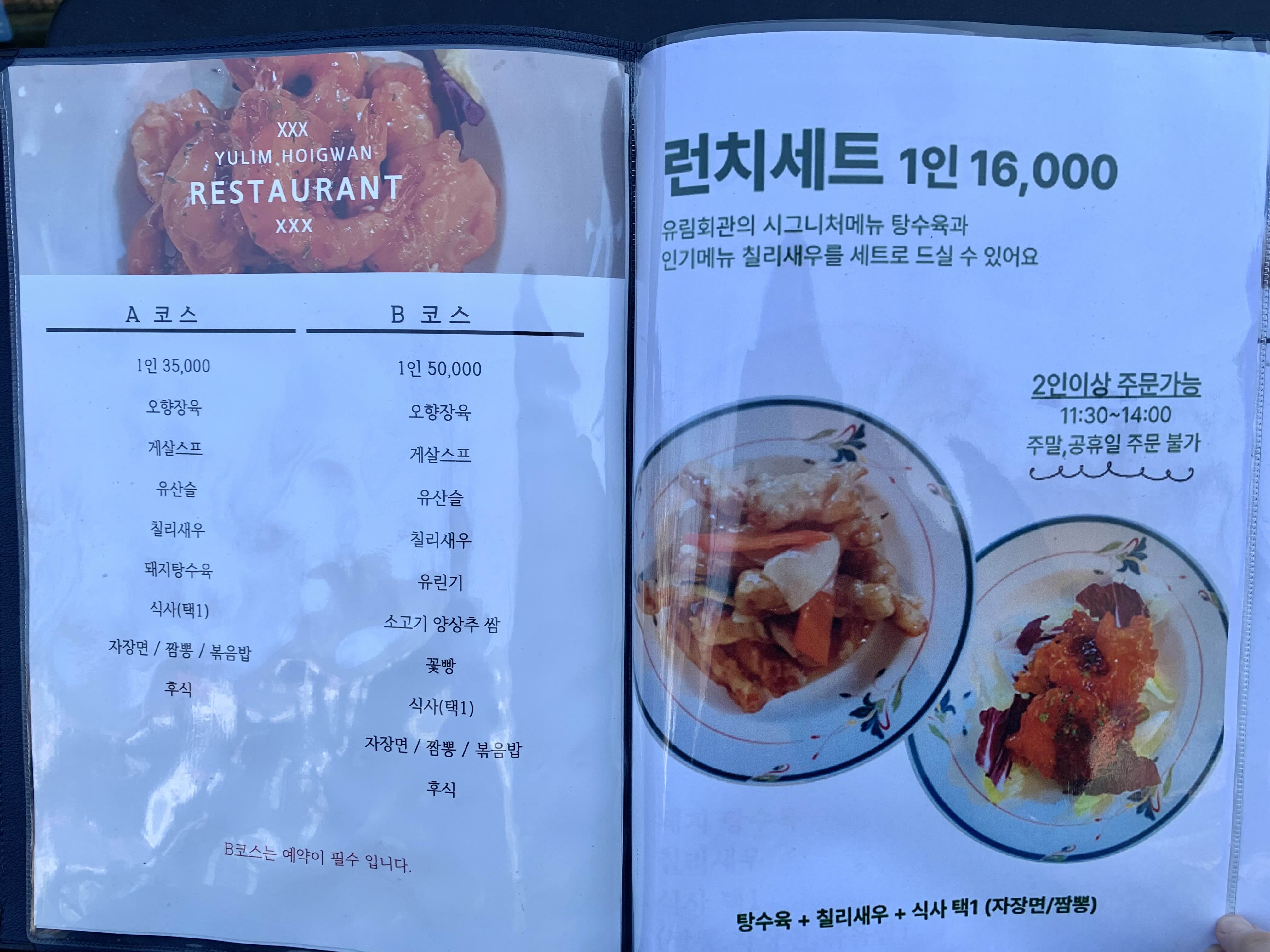 주말과 공휴일에는 주문할 수 없고, 2인이상 주문 가능해요. 탕수육과 칠리새우, 식사 조합이랍니다!