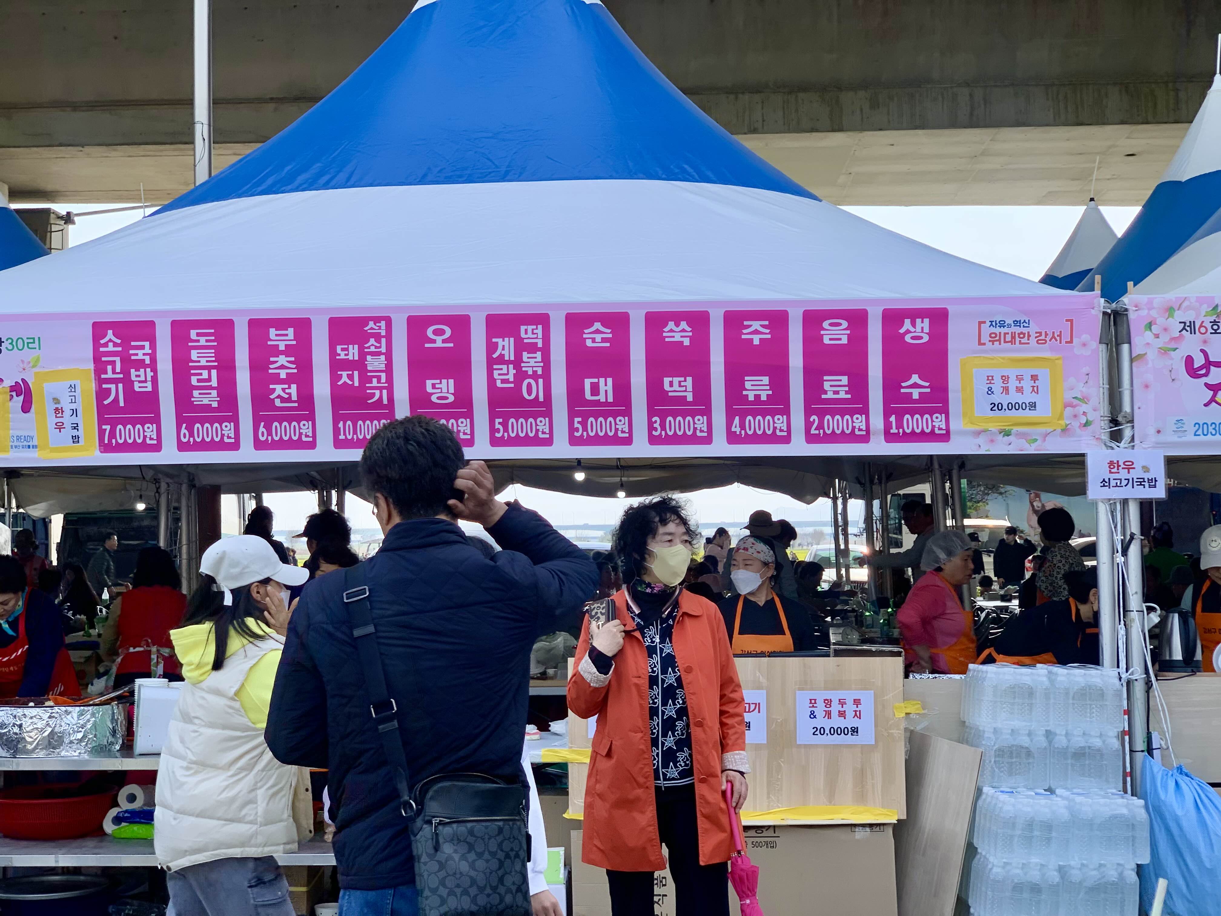 강서 낙동강 30리 벚꽃 축제에는 먹을거리와 함께 볼거리, 즐길거리도 많았는데요. 소고기국밥, 도토리묵, 부추전, 순대, 주류까지 다양하게 판매하고 있었어요.