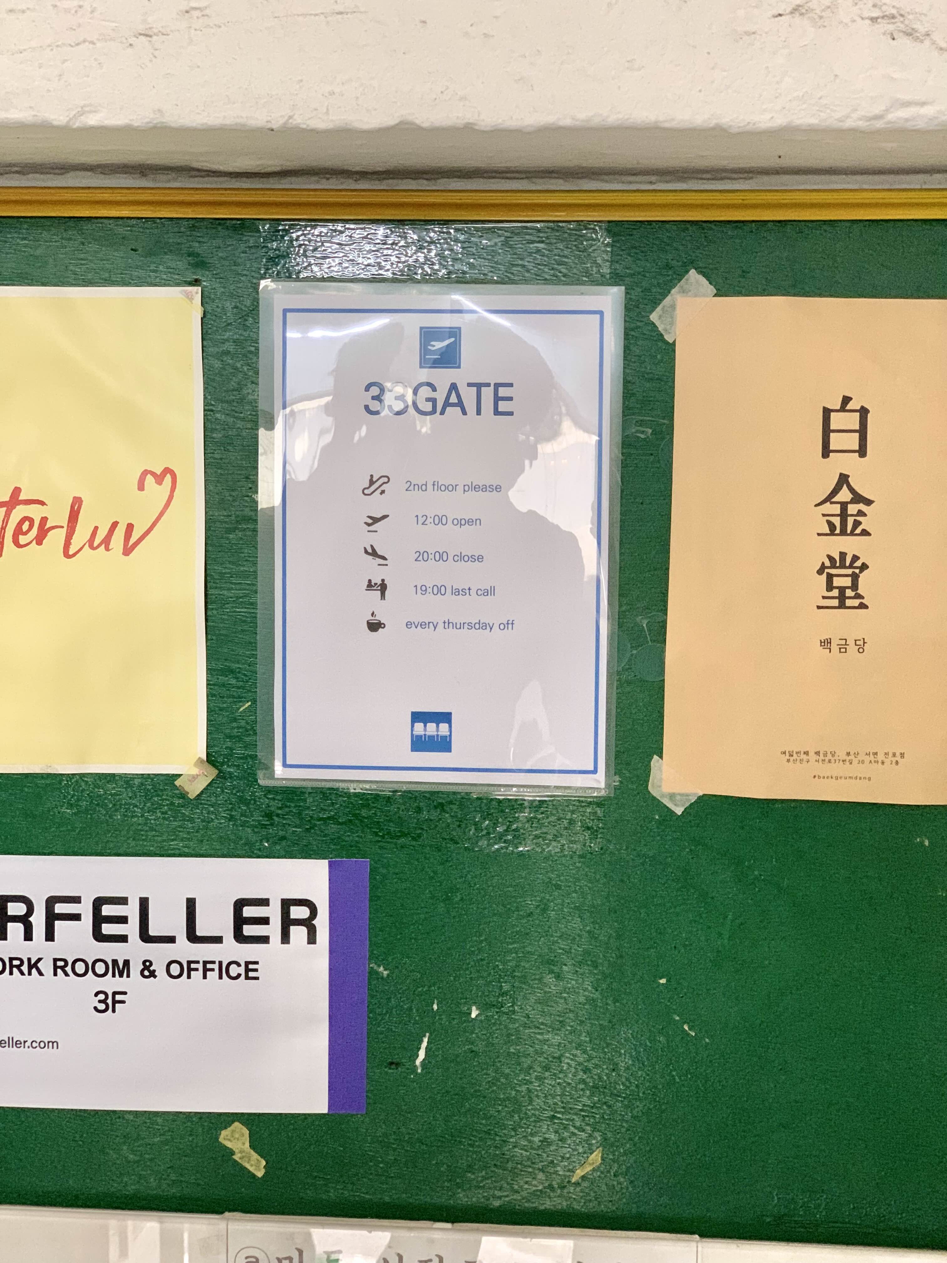 참고로 33게이트는 12시에 오픈, 20시에 닫는답니다. 19시에 라스트오더, 매주 목요일 휴무에요.