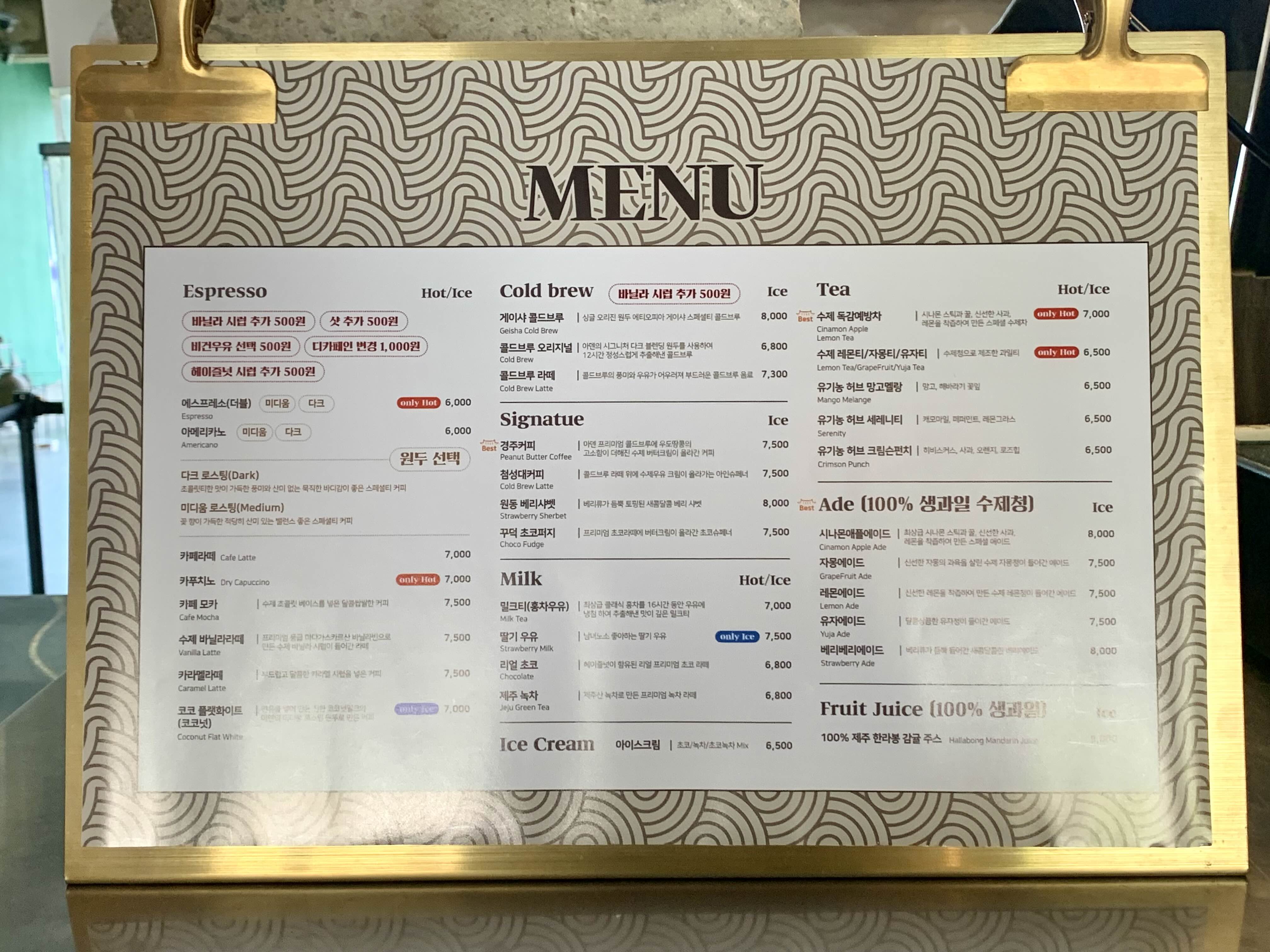참고로 시그니처 메뉴도 있는데요. 경주커피와 첨성대커피를 부산 아덴에서 먹어봤어서 이날은 다른 걸 시켜보았어요! 안 드셔봤다면 시그니처도 추천이요!