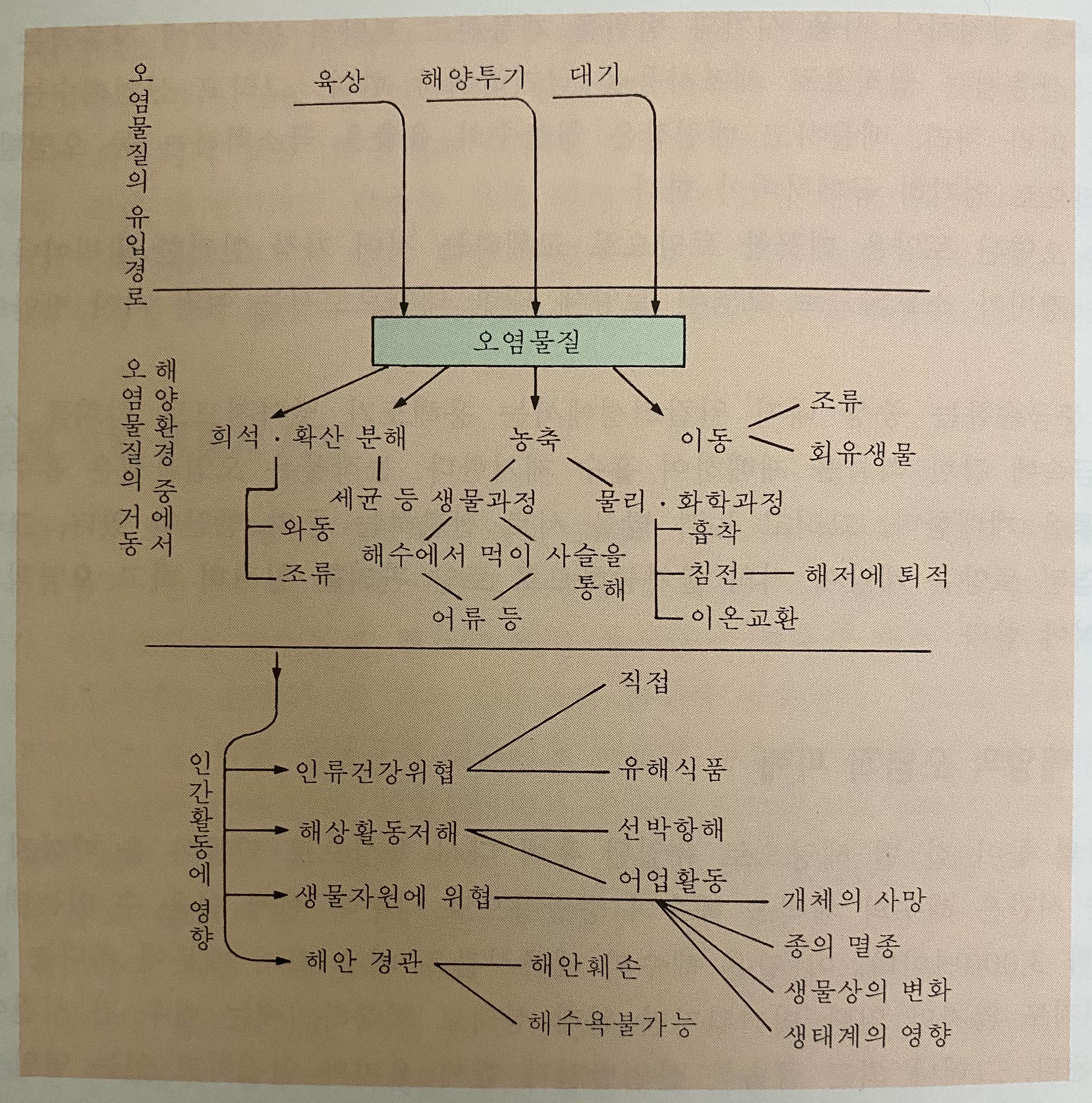 해수의 체적을 해수의 증발량으로 나누면 대략 3,000년인데, 이는 육상의 물이 한 번 해양으로 유입된 후에 다시 육상으로 되돌아 올 때까지 해양에 머무는 시간입니다. 이와 같은 해수의 체류시간은 매우 길기 때문에 바다는 쉽게 더러워지지도 않기도 하지만, 이미 더러워진 상태에서 원래 상태로 회복하는데도 매우 긴 시간이 필요하게 됩니다. 최근에는 급속한 산업발달로 인해 육지와 인접하고 있는 연안 해역에 인간 활동에 의한 해양 환경 문제가 심각하게 발생하고 있습니다. 아래의 그림은 해양에 유입된 오염물질의 거동을 그림으로 나타낸 것입니다. 그림을 살펴보면 여러 경로를 통해 해양에 유입된 오염물질이 해양의 물리적 작용에 의해 희석, 확산되기도 하고 생물학적 작용에 의해 분해, 농축, 이동과정을 거치며 처리되는것을 알 수 있습니다. 이렇게 해양은 자연발생적으로 처리를 하기도 하지만, 오염 물질량이 자연발생적 처리능력을 넘어 유입되면 해양환경 중에 서식하는 생물이나 인간의 해양활동에 나쁜 영향을 주기도 합니다. 때에 따라서는 오염물질의 생물 농축과정을 통해 인간의 건강을 위협하기도 합니다. 이러한 오염문제는 오염물질의 종류 및 해양 생물이나 인간활동에 미치는 영향 등을 고려하여 편의상 아래와 같은 유형으로 구분할 수 있습니다.