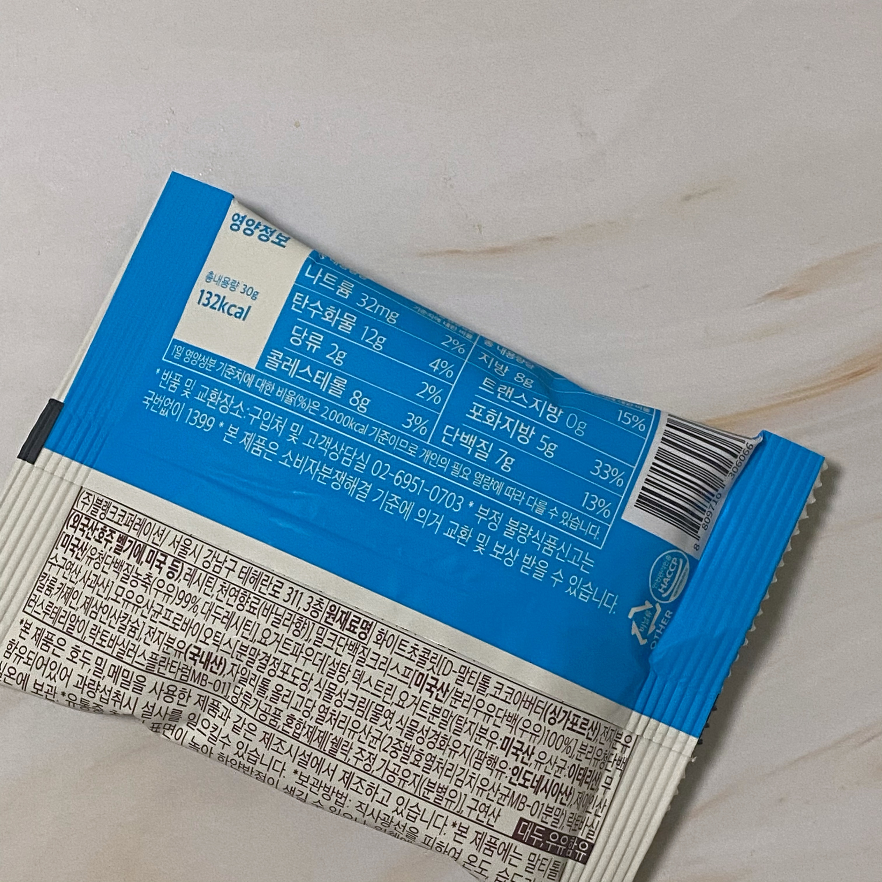 1 봉지로 1일 영양성분 기준치의 14%의 단백질인 7g을 섭취할 수 있어요. 설탕까지 들어있지 않아 당류와 칼로리도 낮은 편이라 다이어트 중 간식으로도 좋아요.