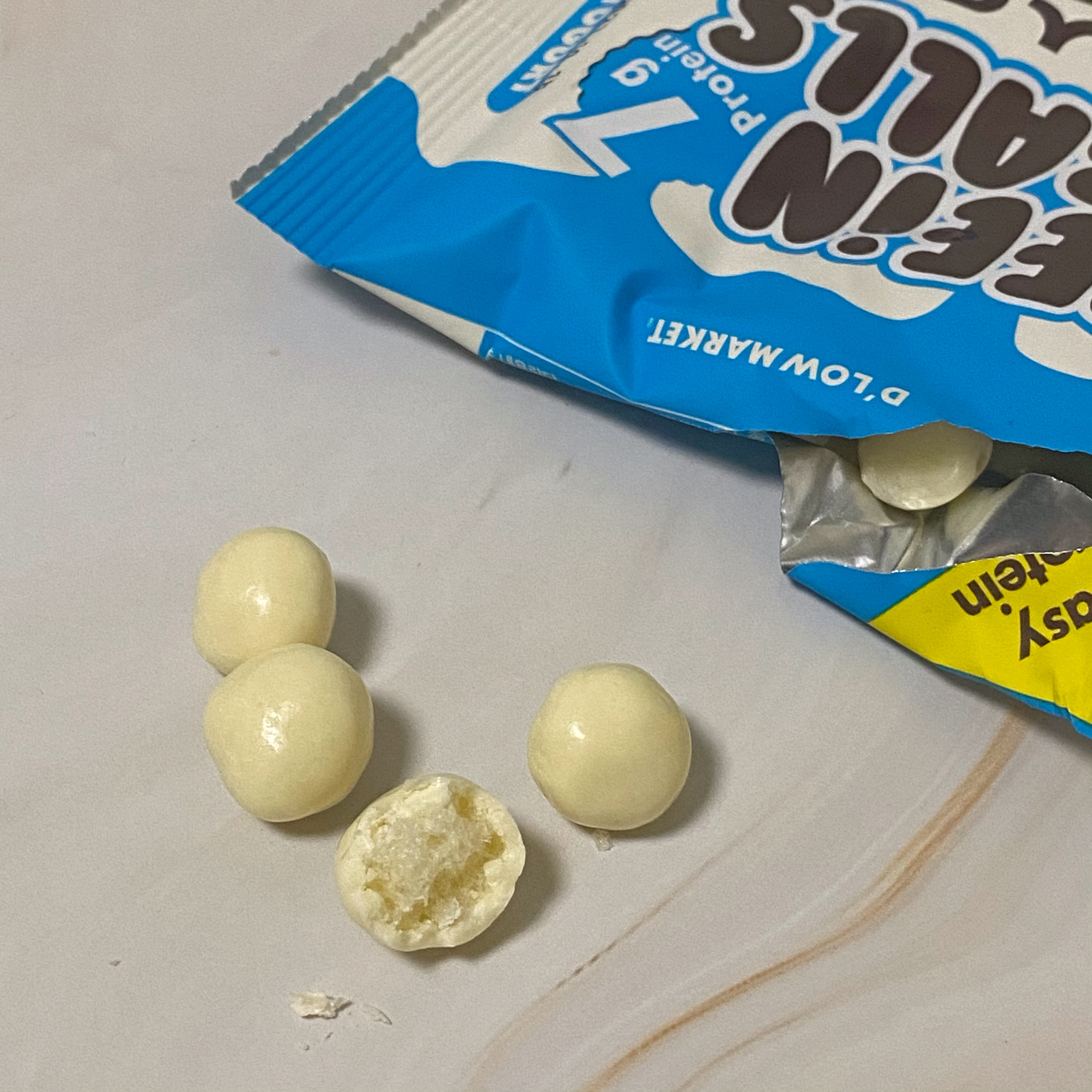 코코아 함량 21.07%, D-말티톨 33.34%, 요구르트 파우더 2.1%(탈지분유 4.5%), 분리 우유단백 17.50%, 유청단백질 농축 4.1%, 모유 유산균 프로바이오틱스 2.1%가 함유되어있는 틴볼스 요거트는 1봉지당 단백질과 유산균도 함께 챙겨 넣었다고 해요.