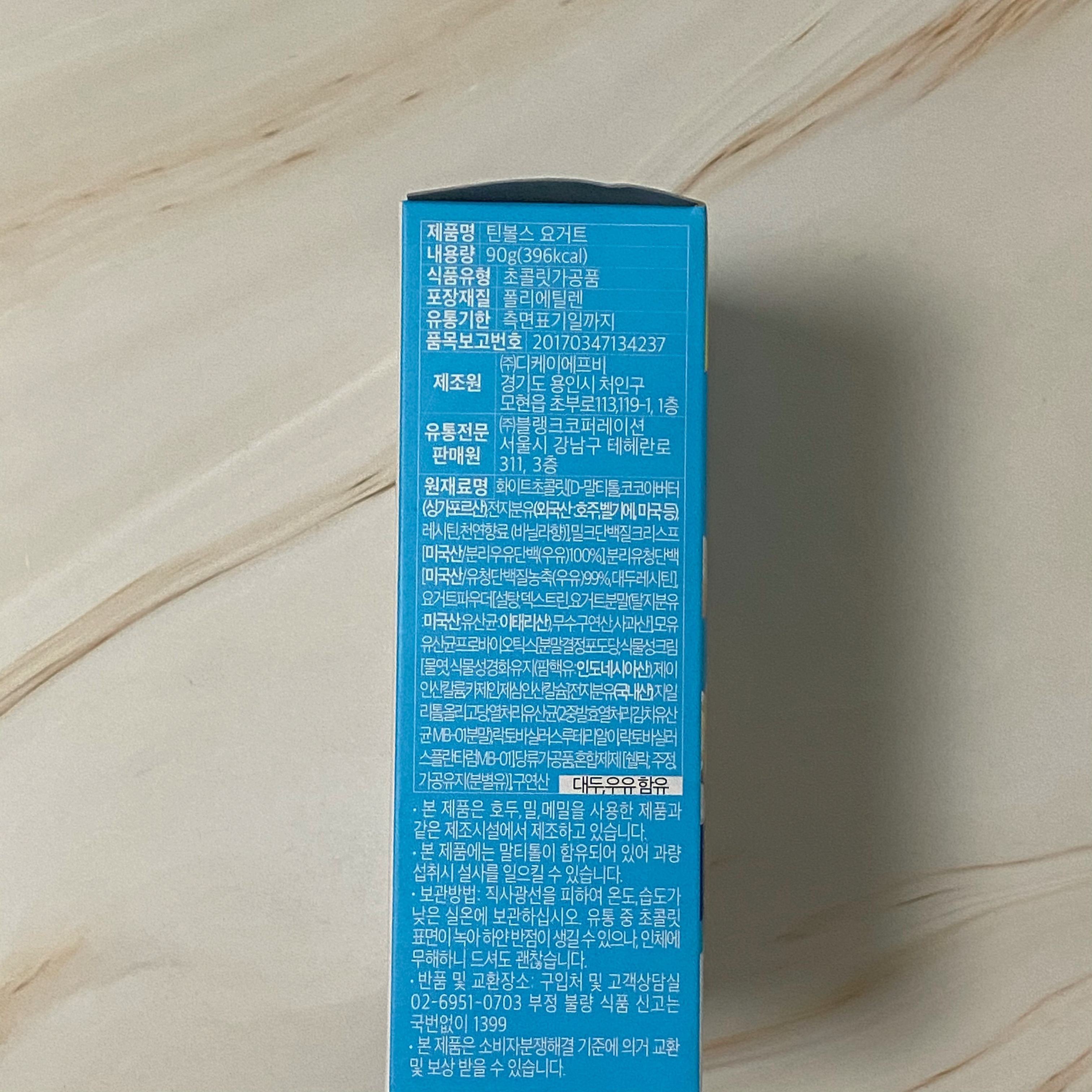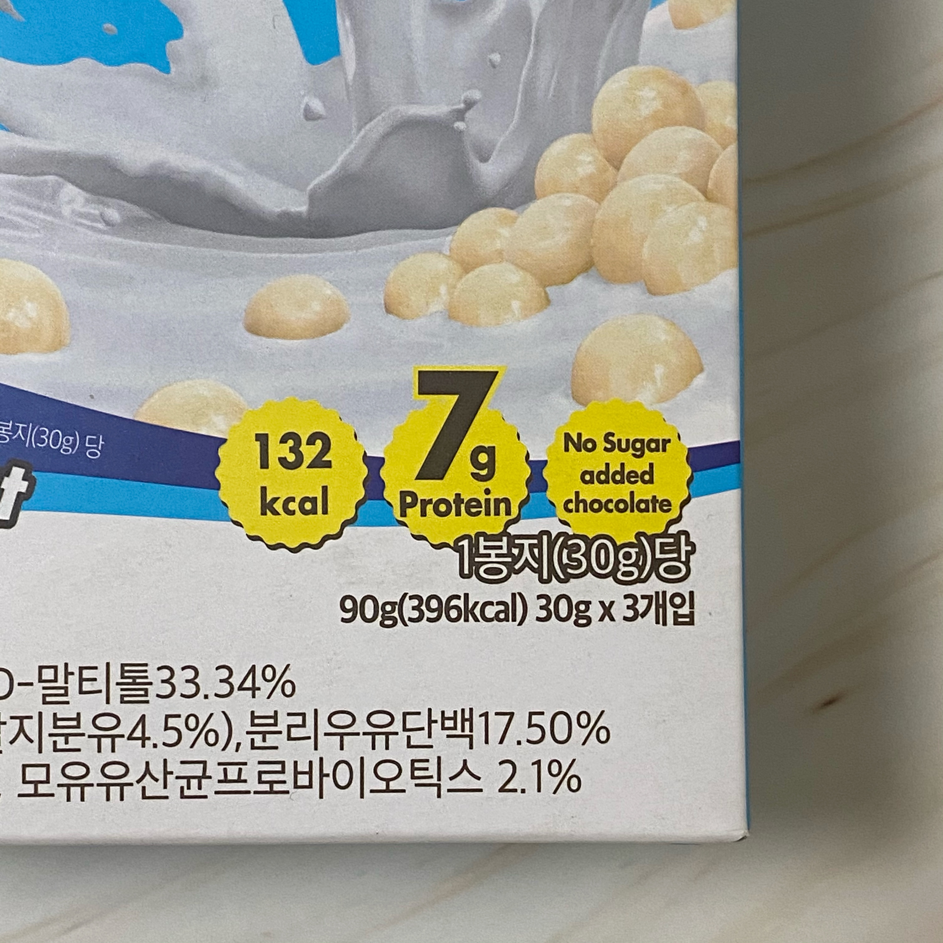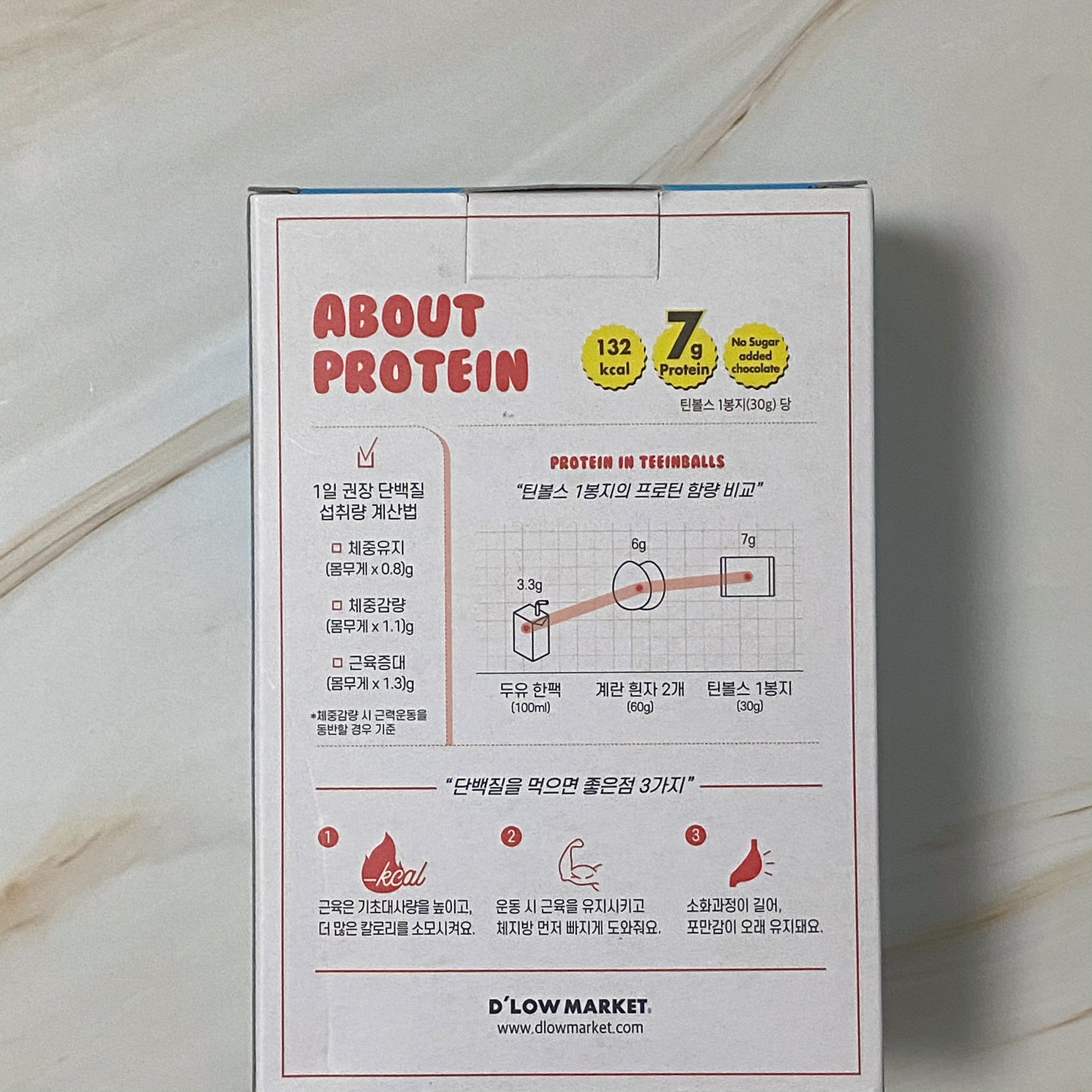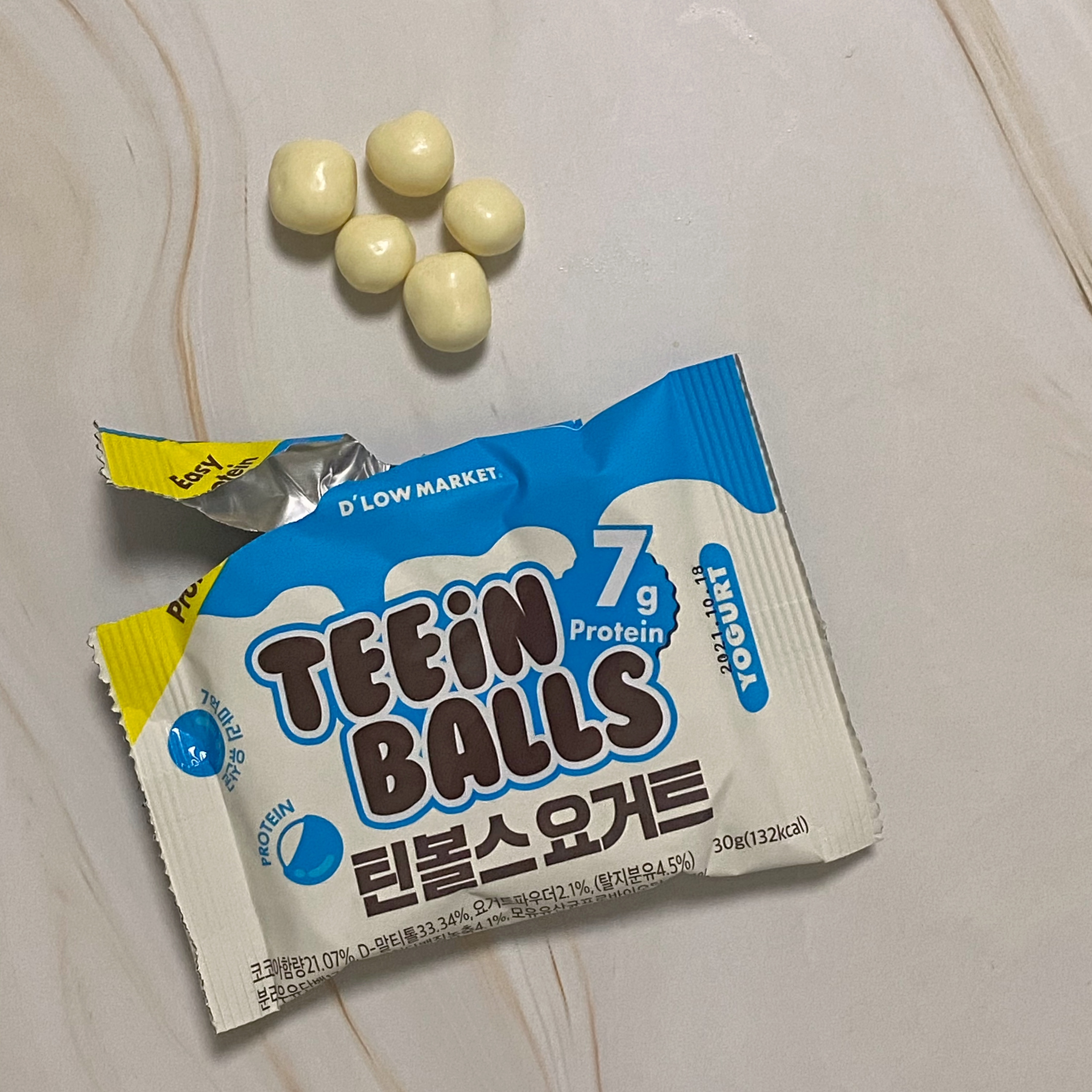 코코아 함량 21.07%, D-말티톨 33.34%, 요구르트 파우더 2.1%(탈지분유 4.5%), 분리 우유단백 17.50%, 유청단백질 농축 4.1%, 모유 유산균 프로바이오틱스 2.1%가 함유되어있는 틴볼스 요거트는 1봉지당 단백질과 유산균도 함께 챙겨 넣었다고 해요.