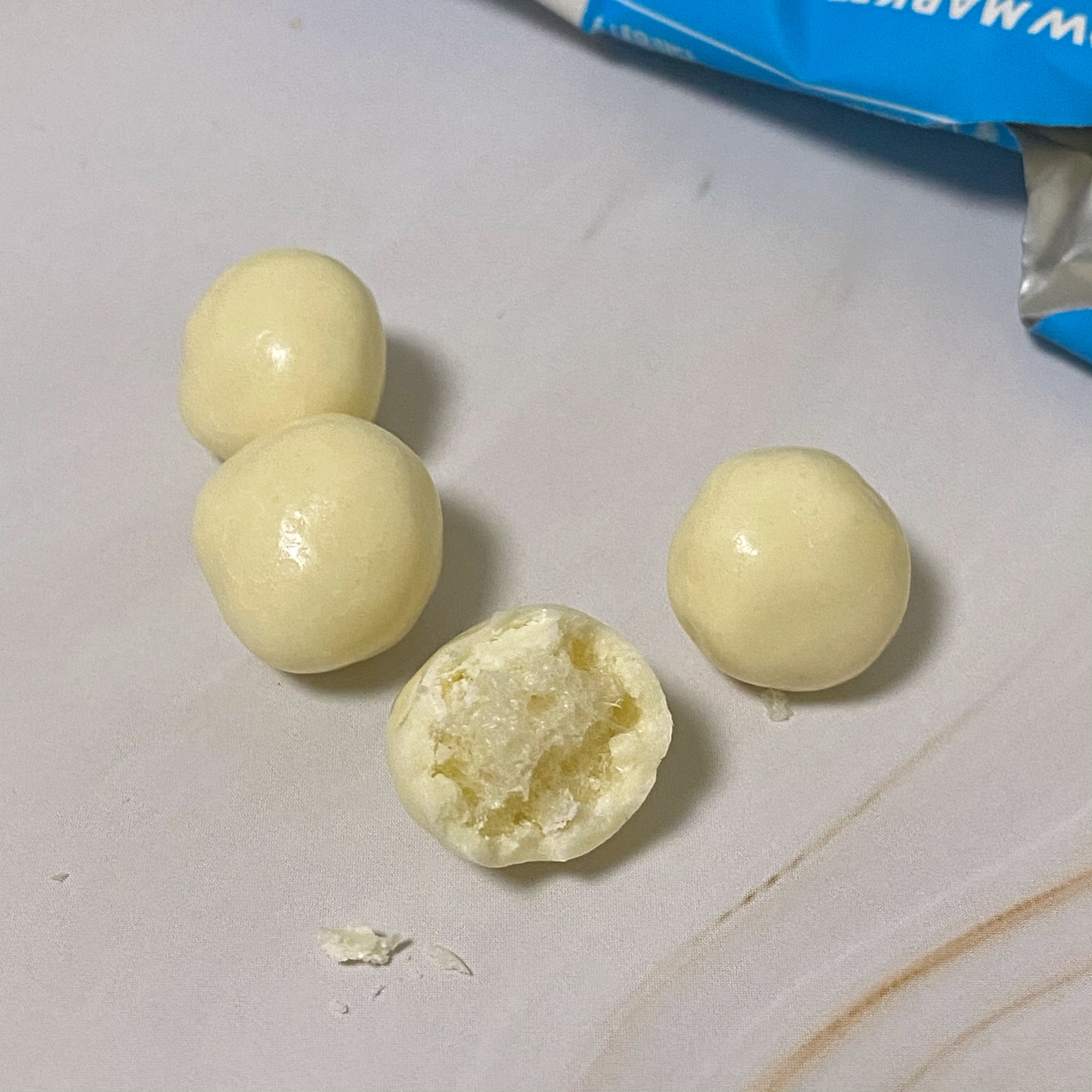 반을 갈라보니 안에는 바삭바삭한 스낵 느낌의 식감이 들어있어요. 요즘 많이 보이는 초코볼의 형태라 누구든 맛있게 먹을 수 있는 간식이지 않을까 싶어요. 안에는 바삭바삭한 식감과 겉에는 달달한 화이트 초코로 입이 만족스럽던 다이어트 간식