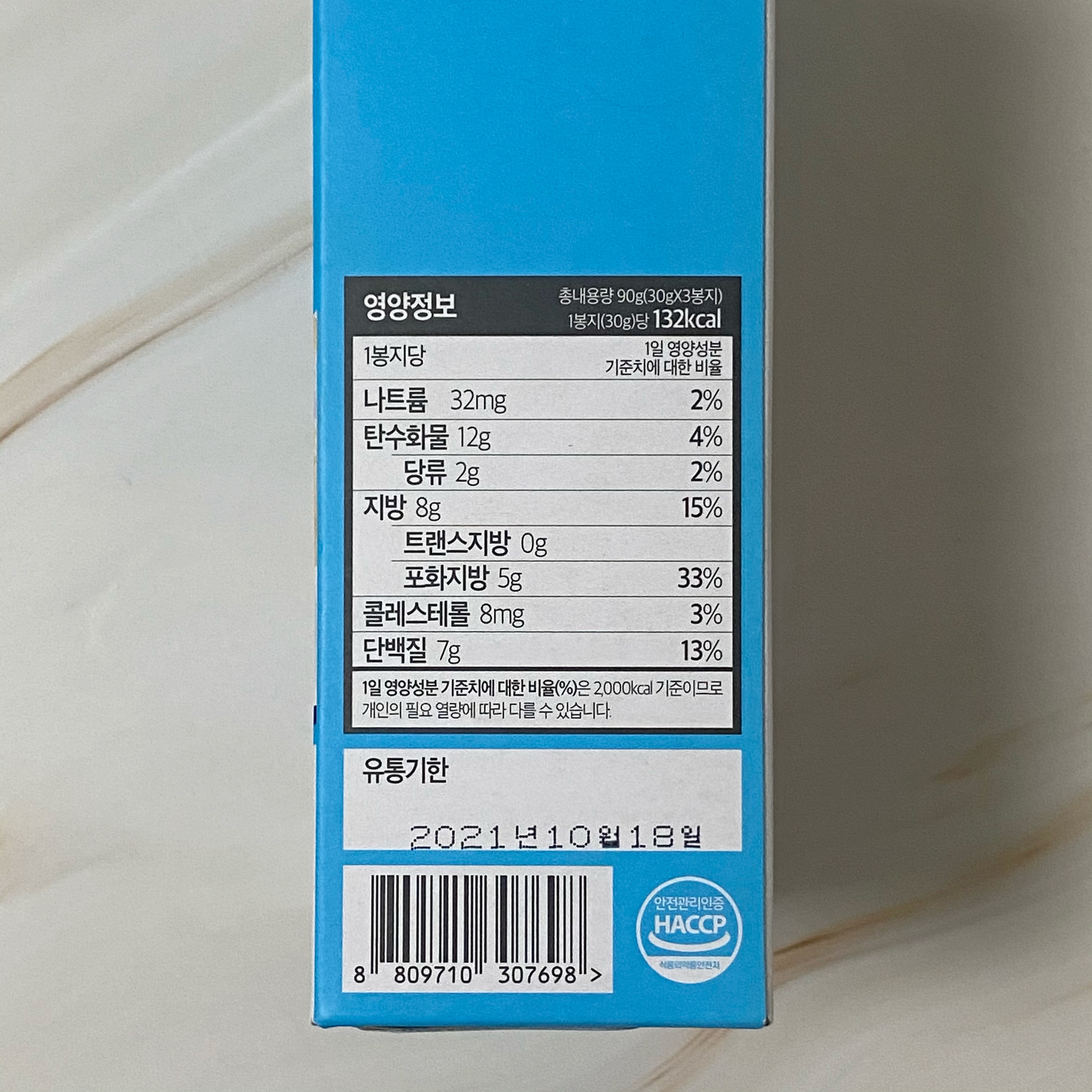 1 봉지로 1일 영양성분 기준치의 14%의 단백질인 7g을 섭취할 수 있어요. 설탕까지 들어있지 않아 당류와 칼로리도 낮은 편이라 다이어트 중 간식으로도 좋아요.