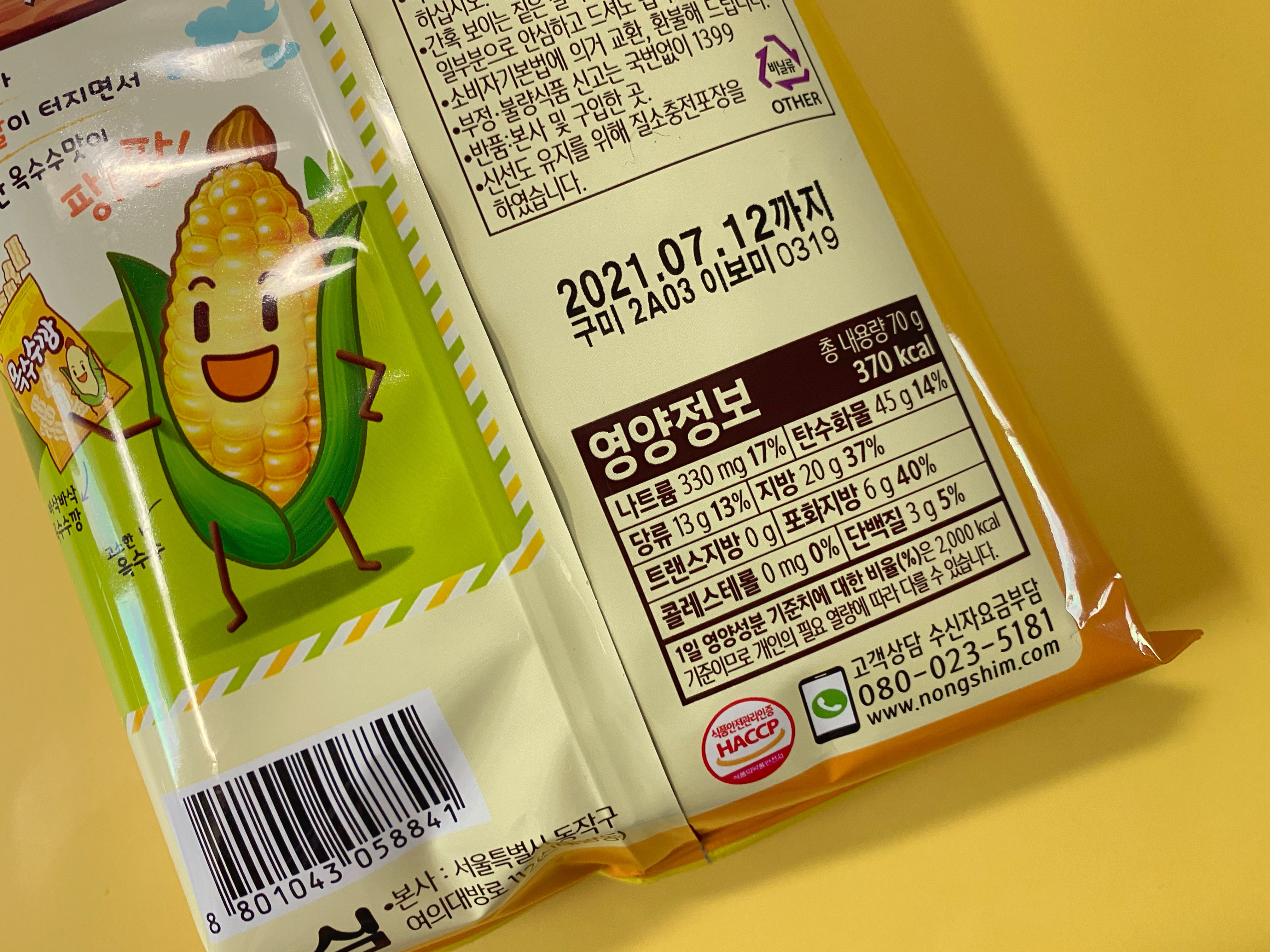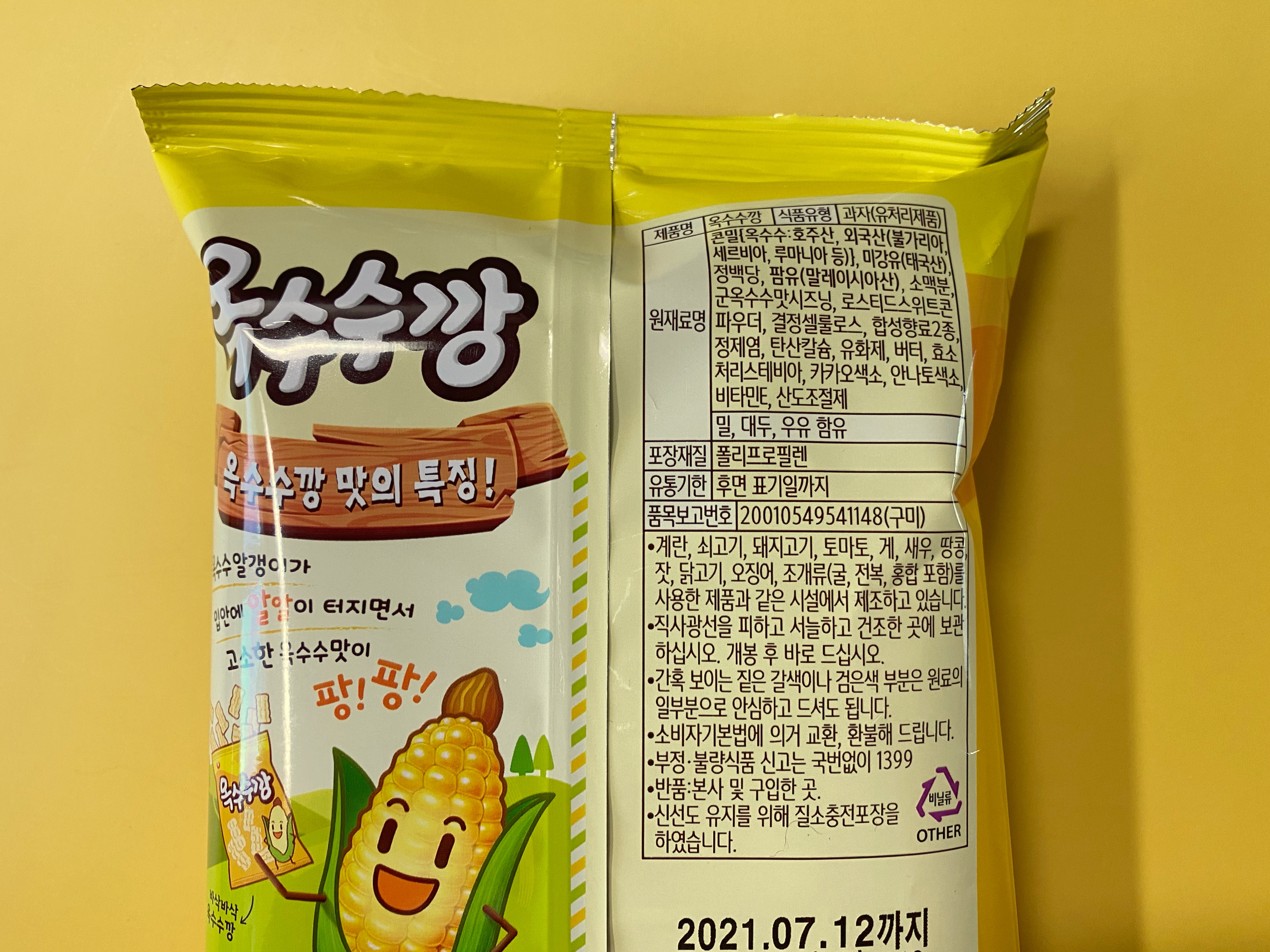 옥수수모양 그대로 들어갔다는 옥수수깡은 옥수수가 52%나 들어있어요. 옥수수 함량이 높은만큼 진한 옥수수의 맛이 느껴지기 때문에 더욱 인기가 많지 않을까 싶습니다.