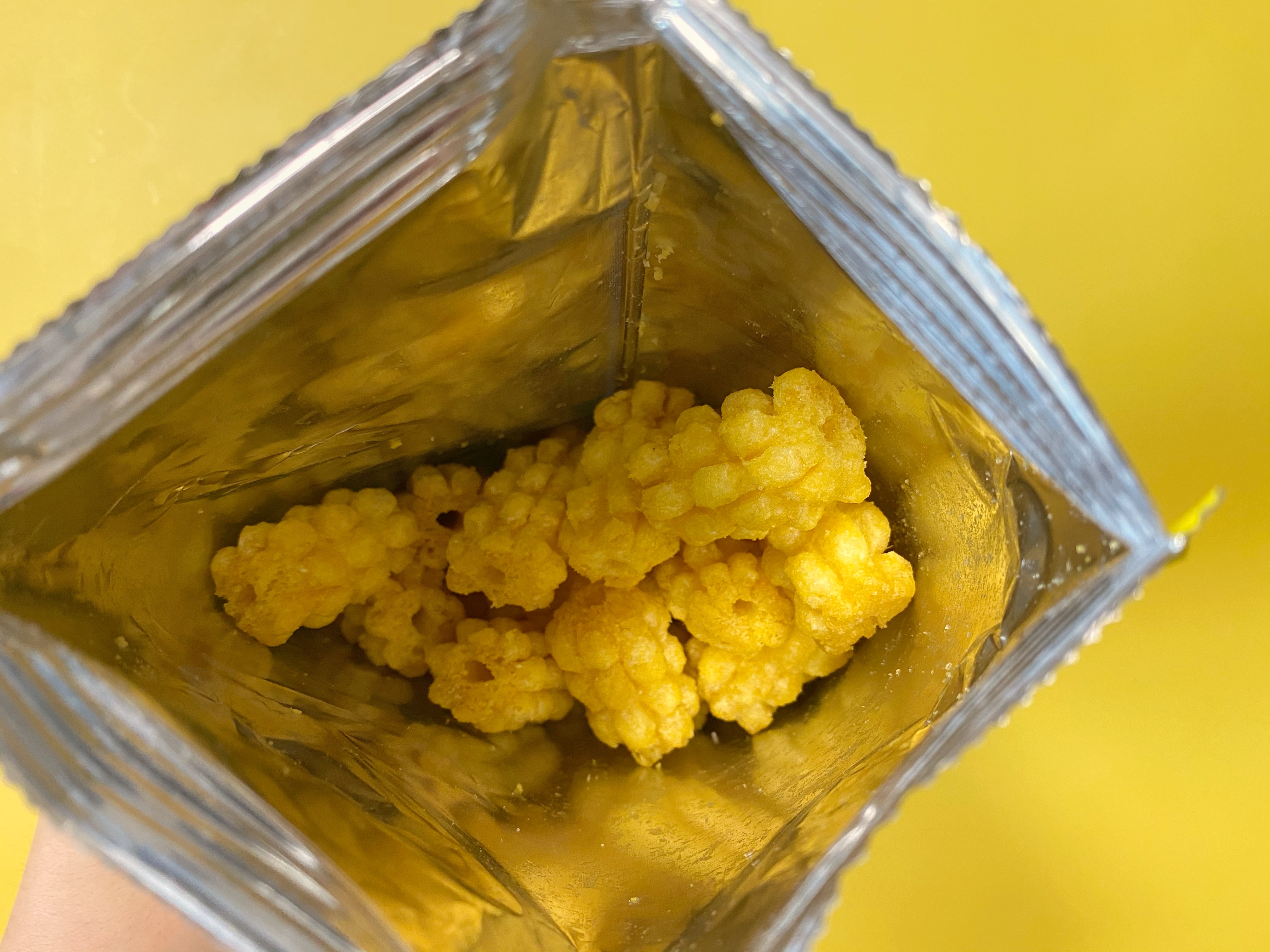 모양은 옥수수가 떠오르는 모양! 너무 크지도 않고 너무 작지도 않아 한입에 넣기 좋은 크기였습니다. 일반 다른 과자들에 비해서는 조금 큰 느낌이 들기도 했어요.