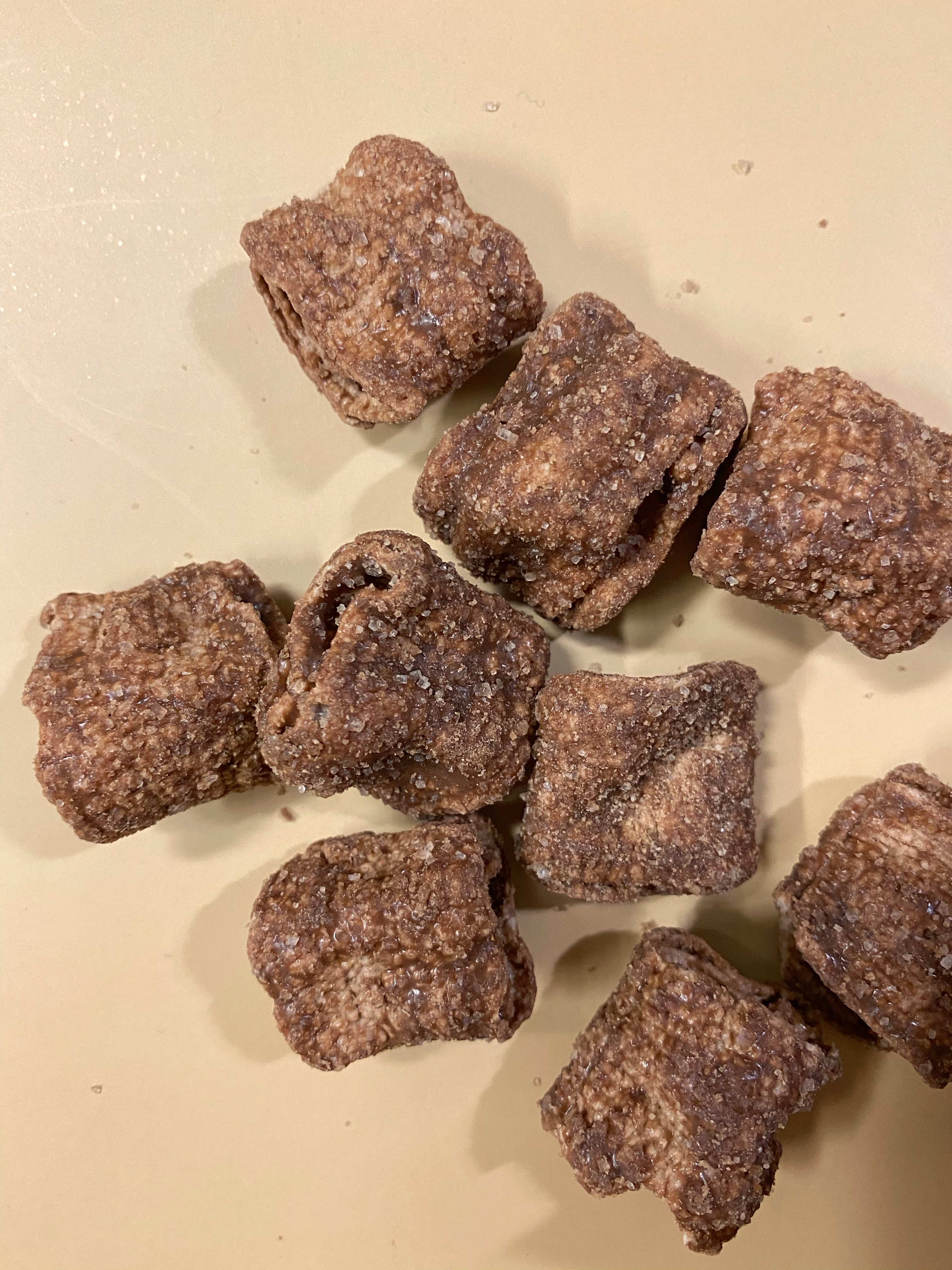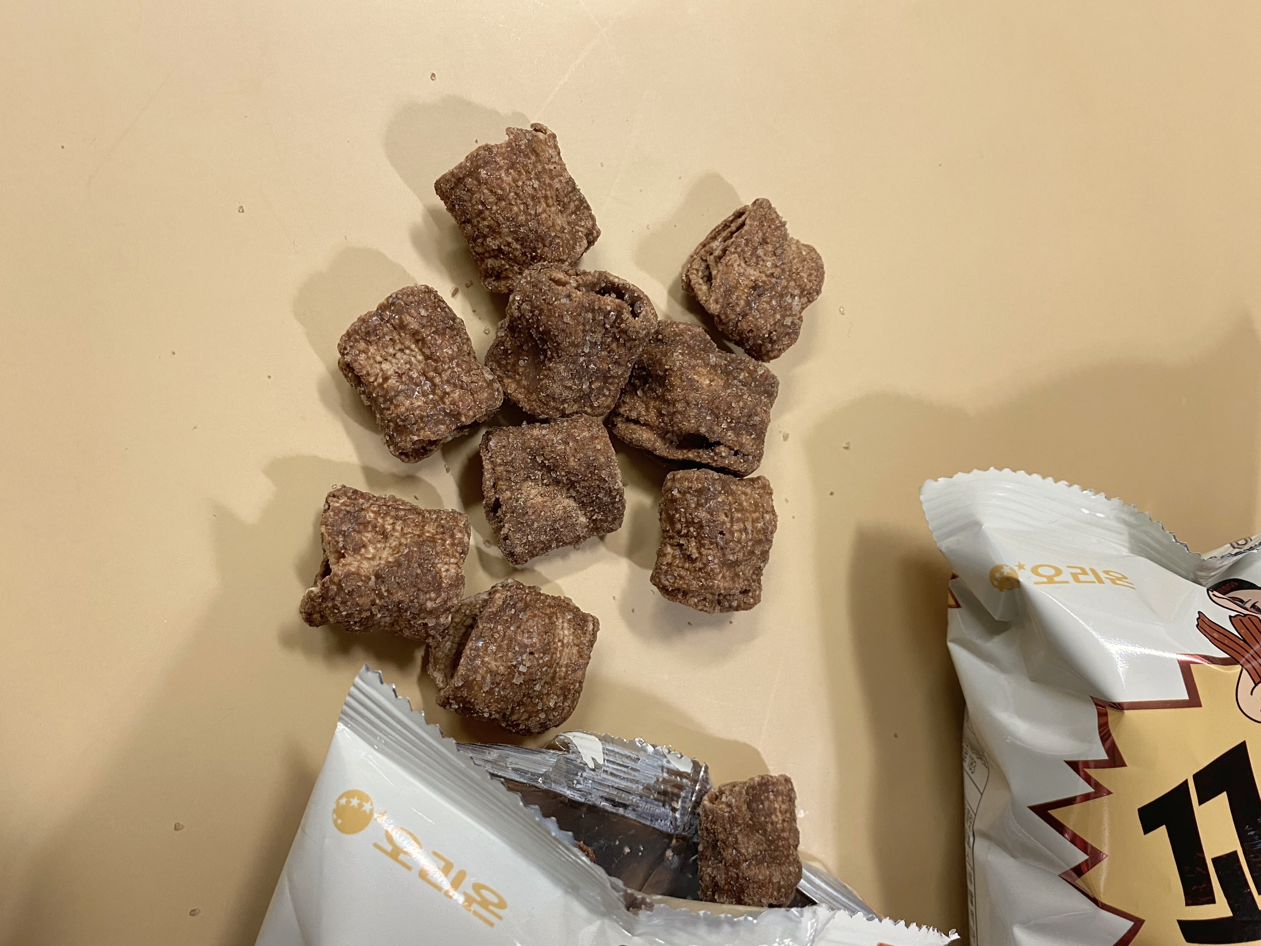 겉이 슈가 토핑도 보이시죠! 이 슈가 토핑과 초콜릿 덕분에 달달함이 가득했던 과자입니다. 콘스프맛이 짭짤한 맛에 가까웠다면 이건 완전 달달! 당 충전이 필요할 때 먹으면 좋을 과자입니다.