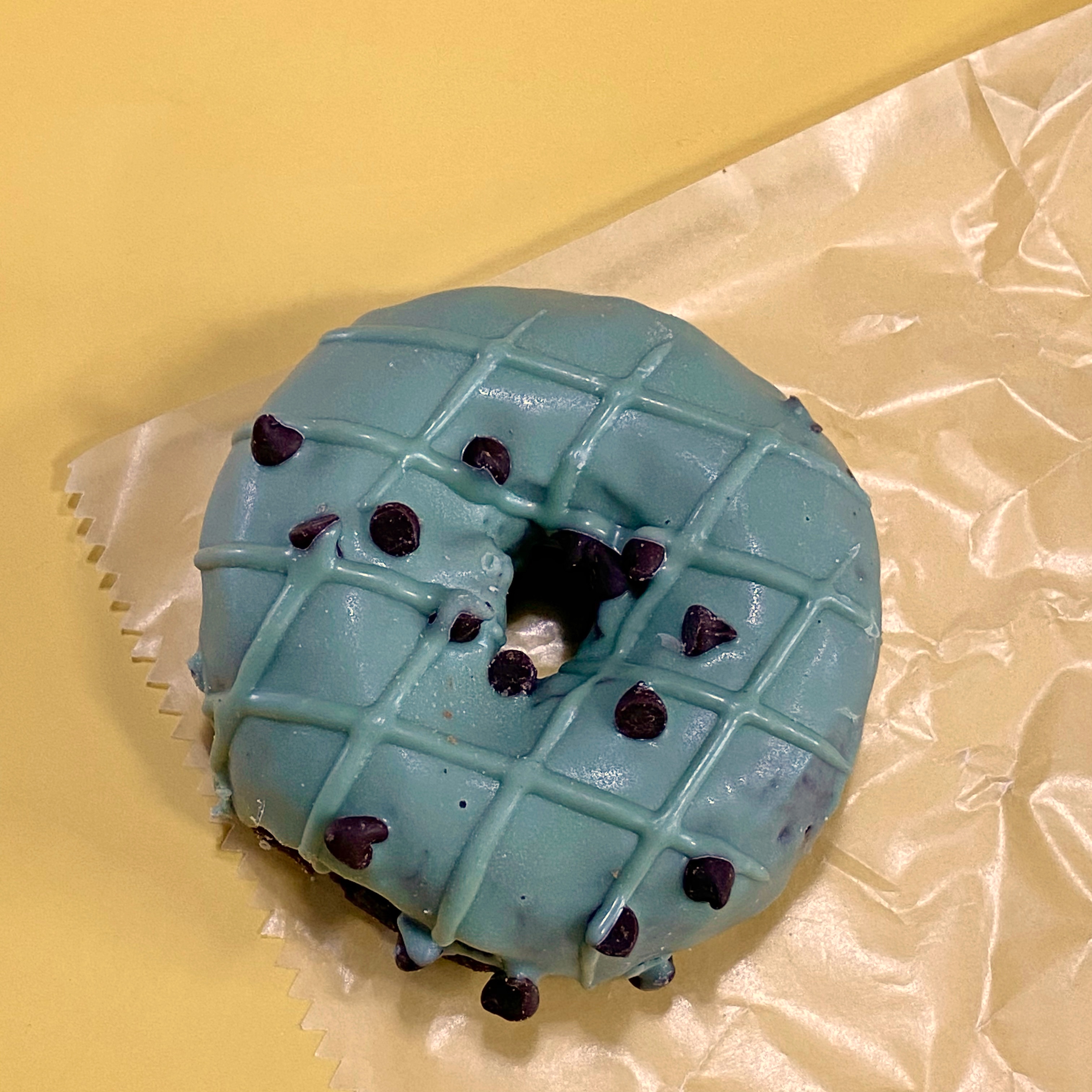 민트코팅 위에 미니 허쉬 초코칩이 토핑되어있는 초코케이크 도넛입니다.