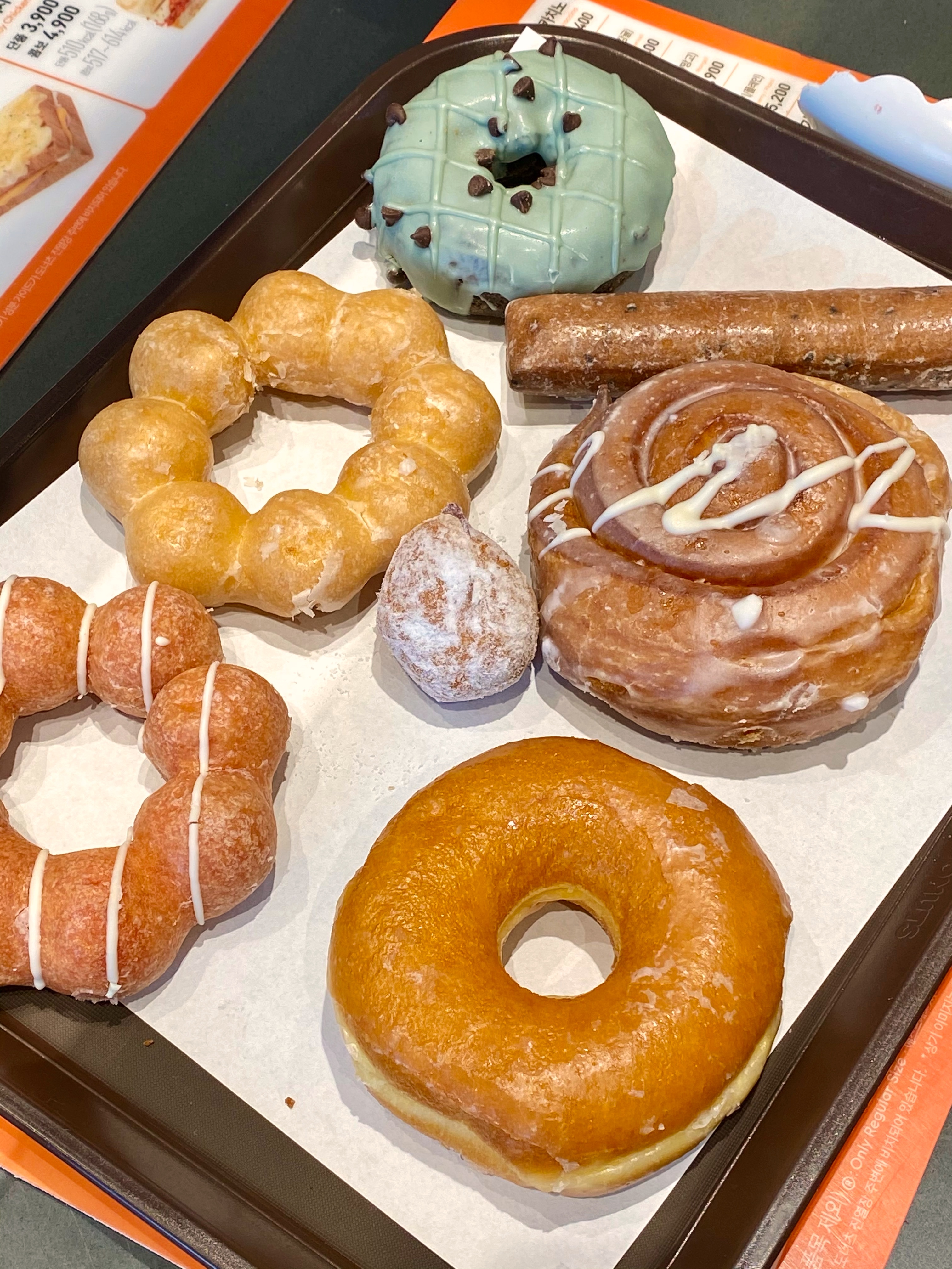 허쉬 민트초코 / 올리브 츄이스티 / 허니찹쌀스틱 / 스트로베리 먼치킨 / 연유에 빠진 시나몬 롤 / 봄날의 딸기 츄이스티 / 페이머스 글레이즈드 입니다. 총 9,000원이었습니다.