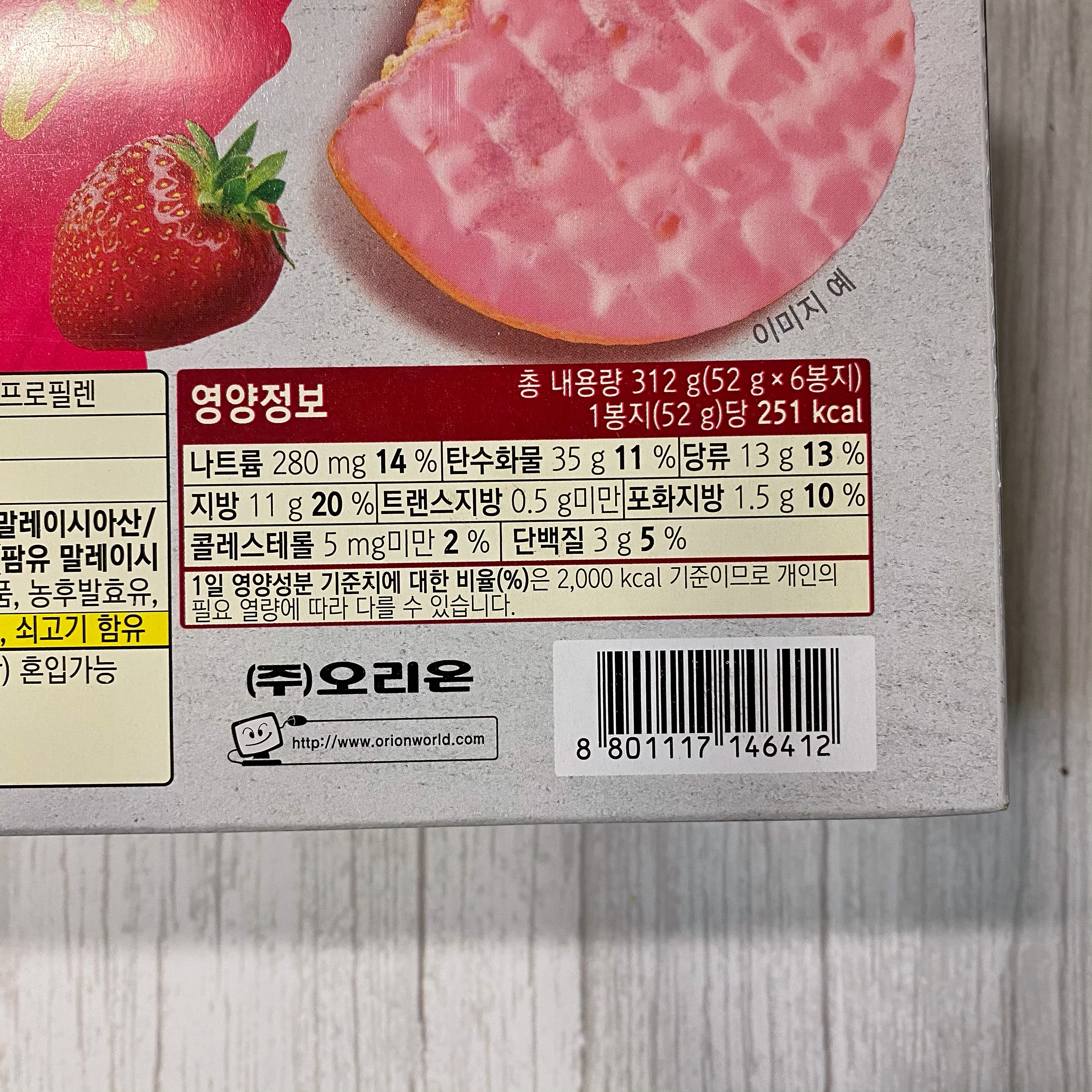 딸기 스프레드가 22%, 통밀이 13% 들어있는 과자입니다.