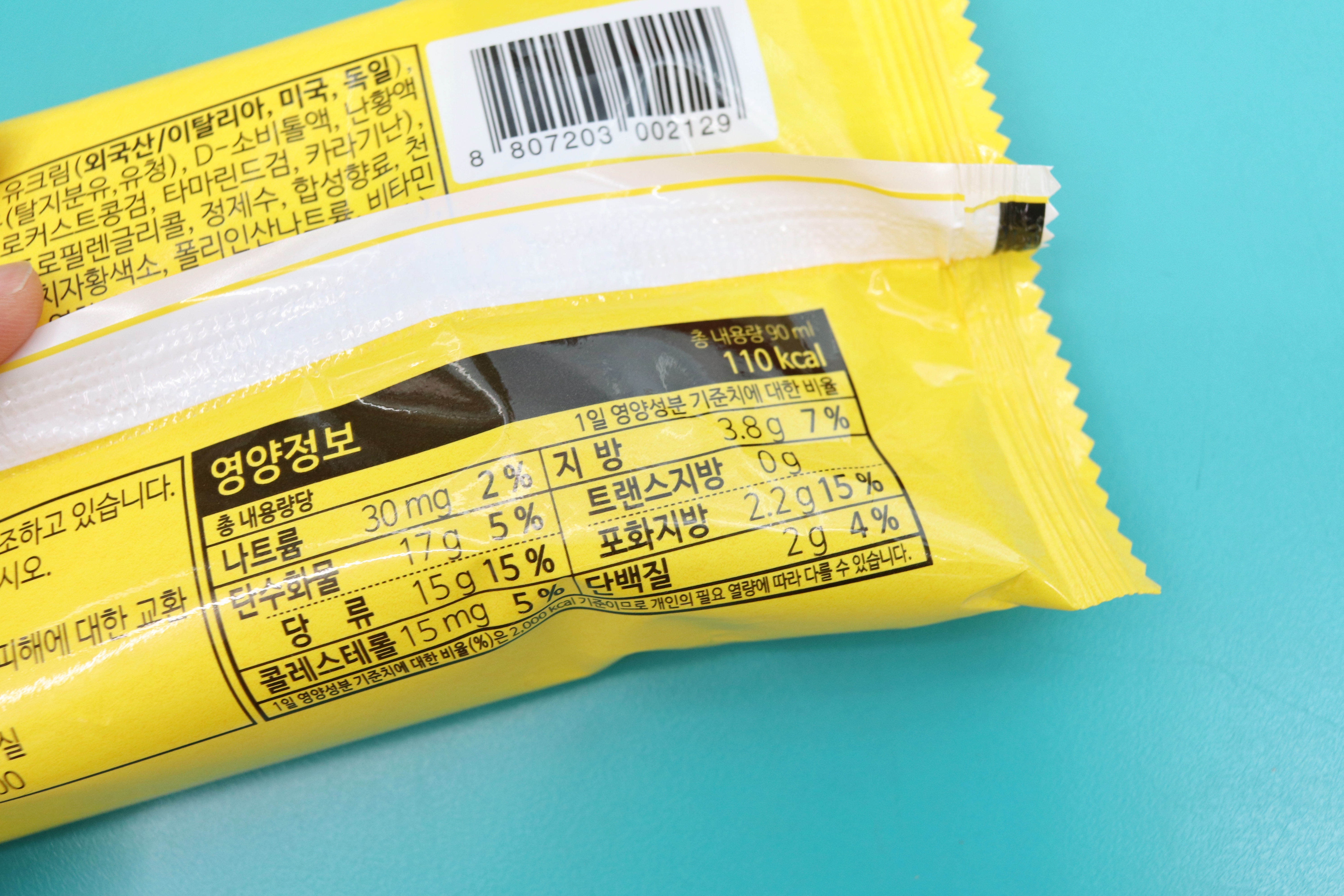 아이스크림이니 당연히 냉동보관 해주어야하고, 유지방이 4%들어있답니다. 하나를 다 먹으면 110kcal에요. 바라서 그런지 콘같은 아이스크림에 비하면 착한 칼로리네요.
