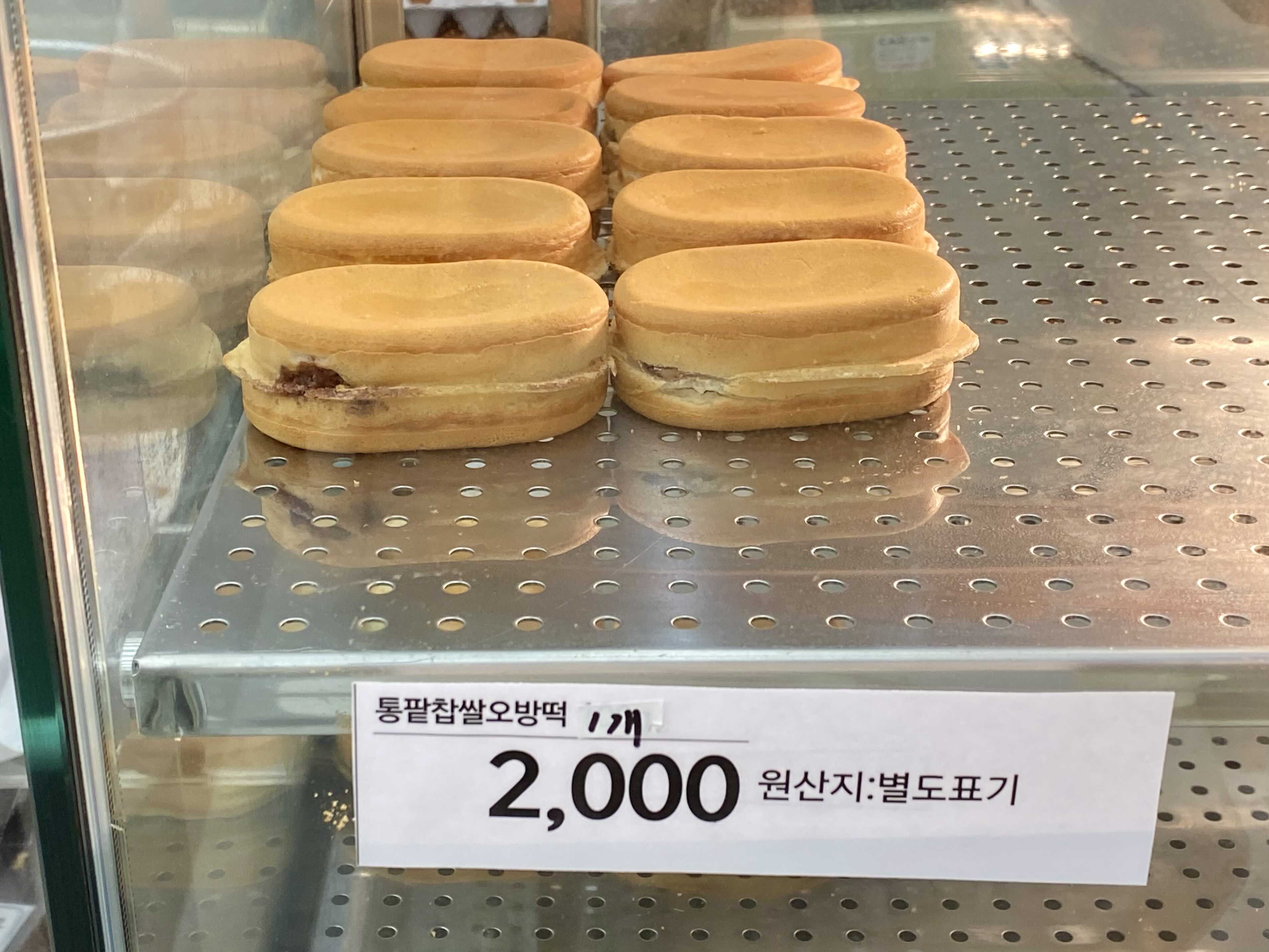 풀빵의 일종이라고 해 풀빵과 비슷할거라 생각했지만 찹쌀이라 그런지 풀빵과는 완전히 다른 식감처럼 보이더라구요. 모양은 빵이었지만 떡에 더 가까운 식감을 내는 오방떡이었습니다. 안에는 슈크림이 들어있어 달달했구요.