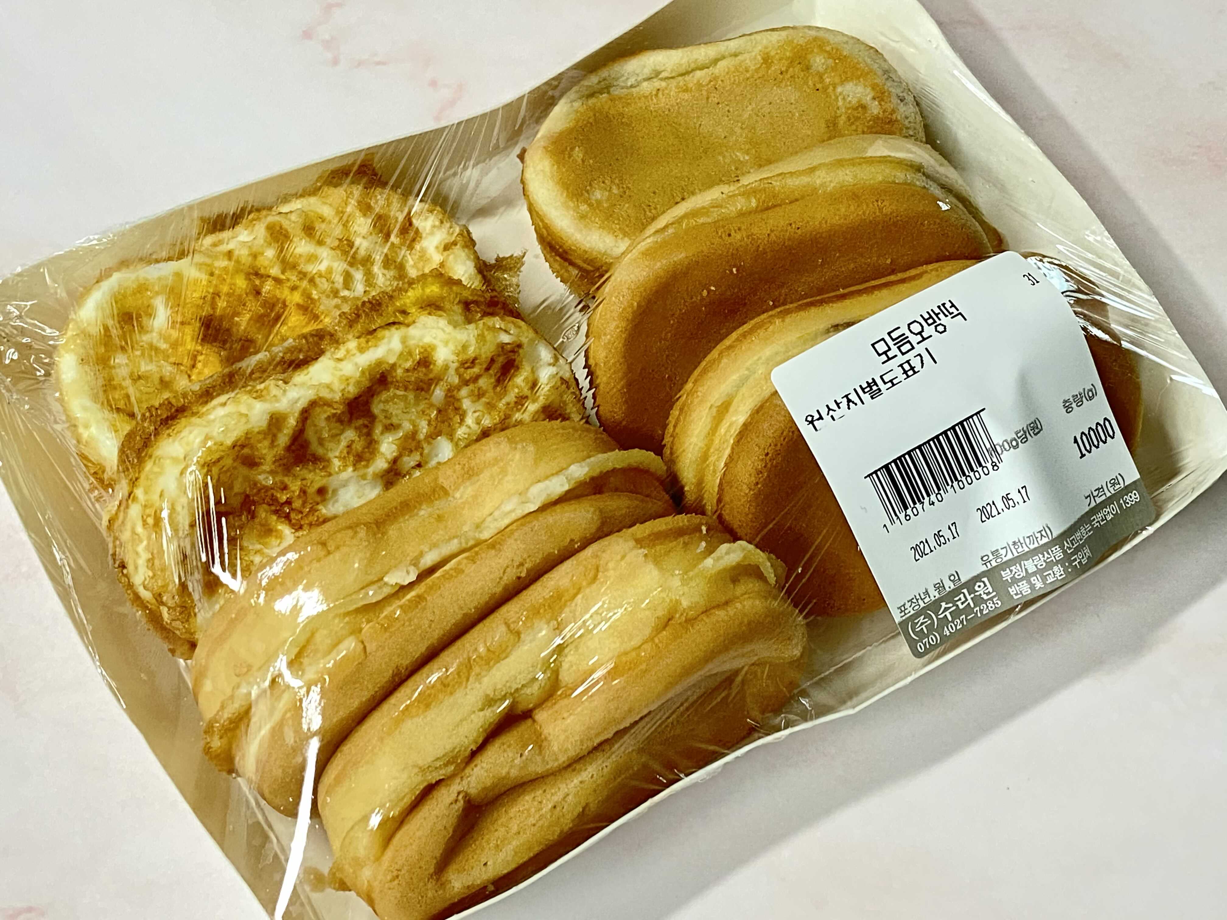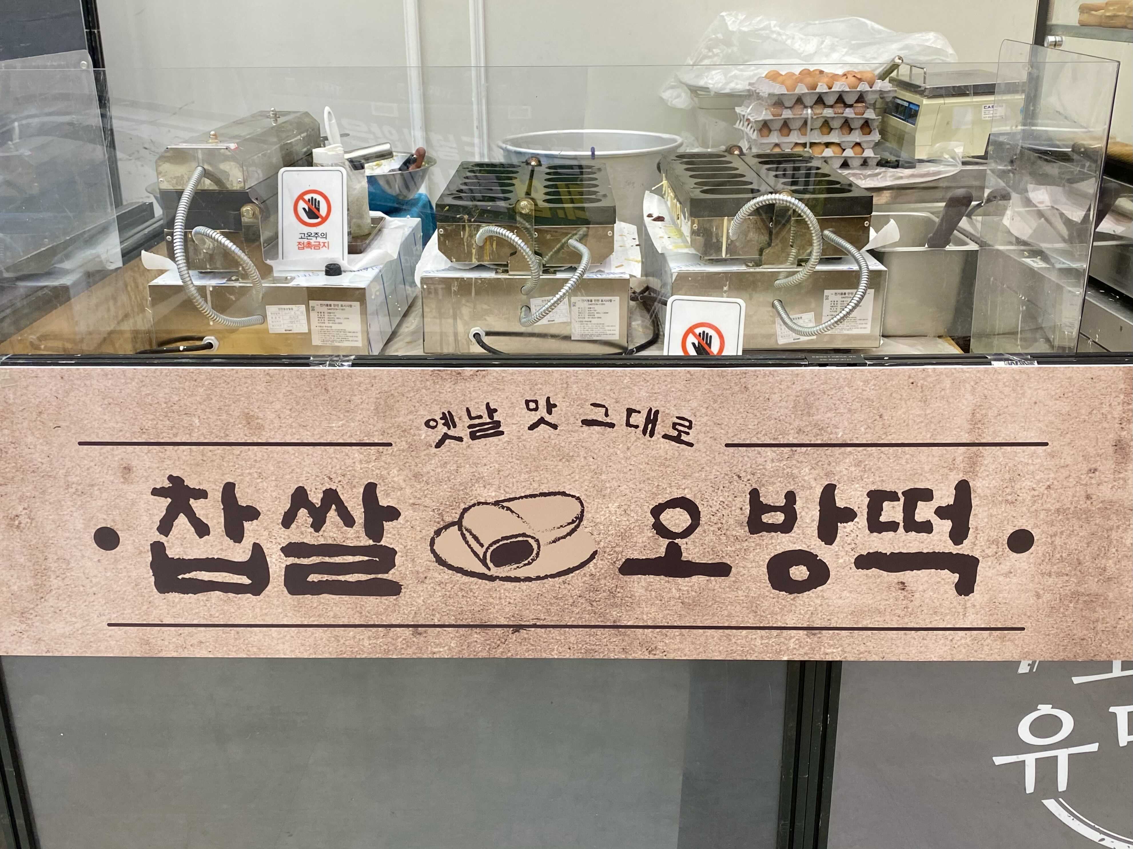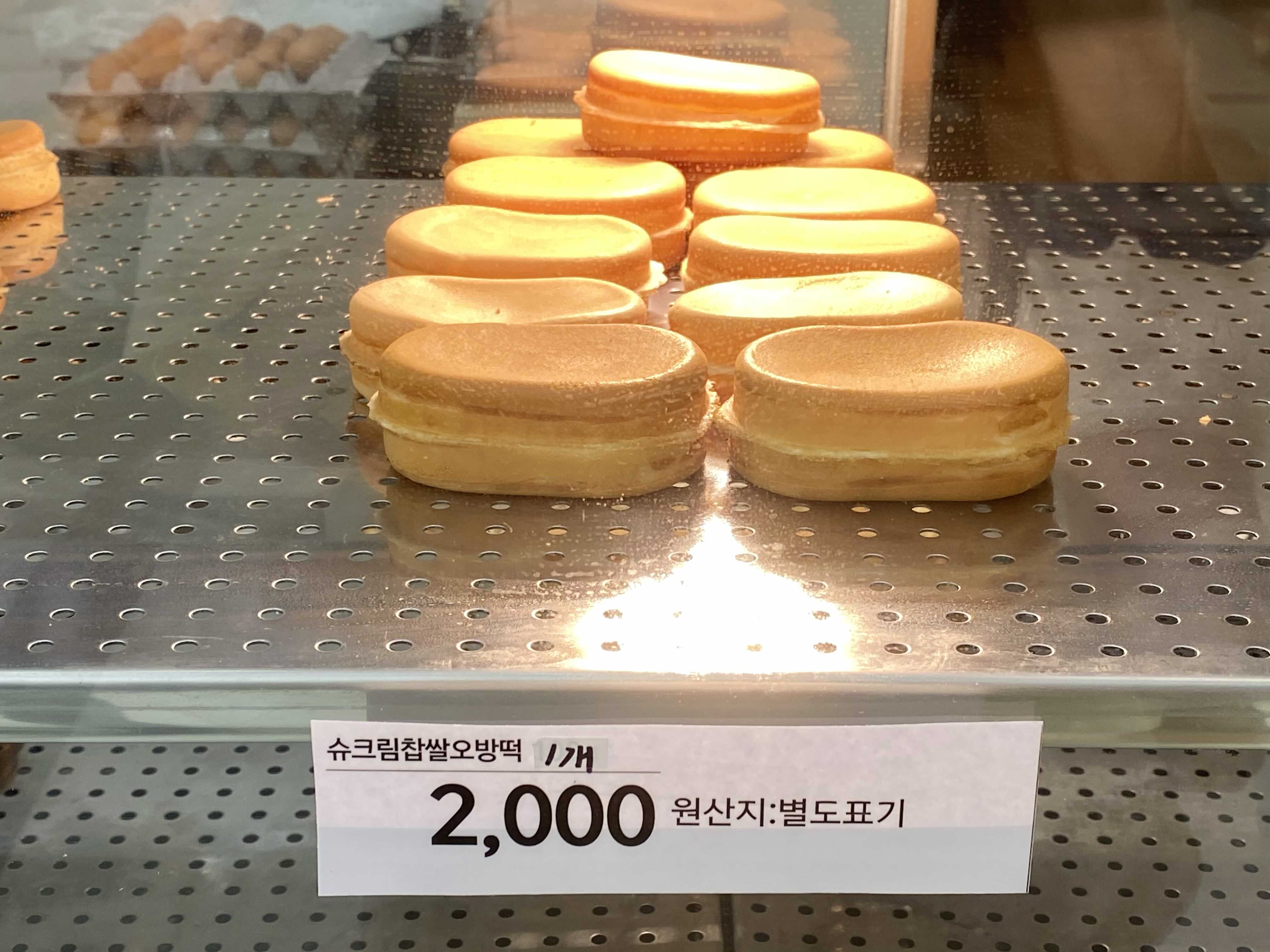 풀빵의 일종이라고 해 풀빵과 비슷할거라 생각했지만 찹쌀이라 그런지 풀빵과는 완전히 다른 식감처럼 보이더라구요. 모양은 빵이었지만 떡에 더 가까운 식감을 내는 오방떡이었습니다. 안에는 슈크림이 들어있어 달달했구요.