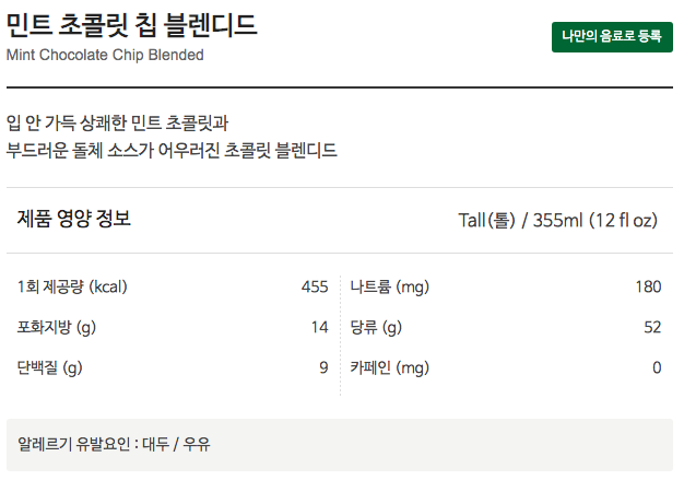 민트 초콜릿 칩 블렌디드 영양정보