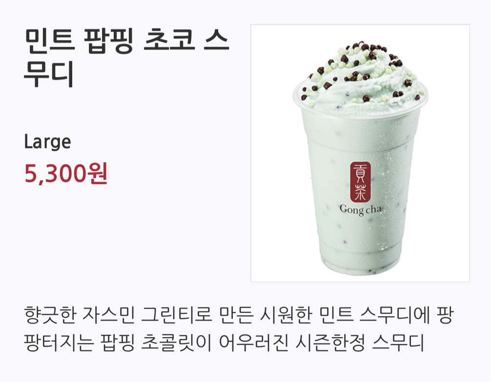 안녕하세요. 민초단은 오늘도 민트초코 메뉴를 소개해드리도록 하겠습니다. 공차에서 나온지 조금 되긴 했지만 이제서야 먹어봤어요!
