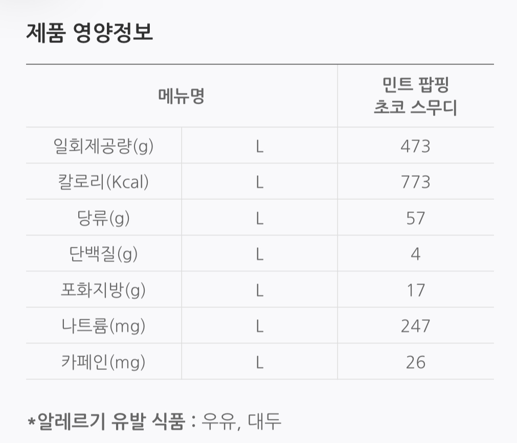 거기에다가 팡팡 터지는 팝핑 초콜릿까지 올라가 더욱 상쾌함을 느낄 수 있어요. 그럼 칼로리도 이어서 알아볼까요!