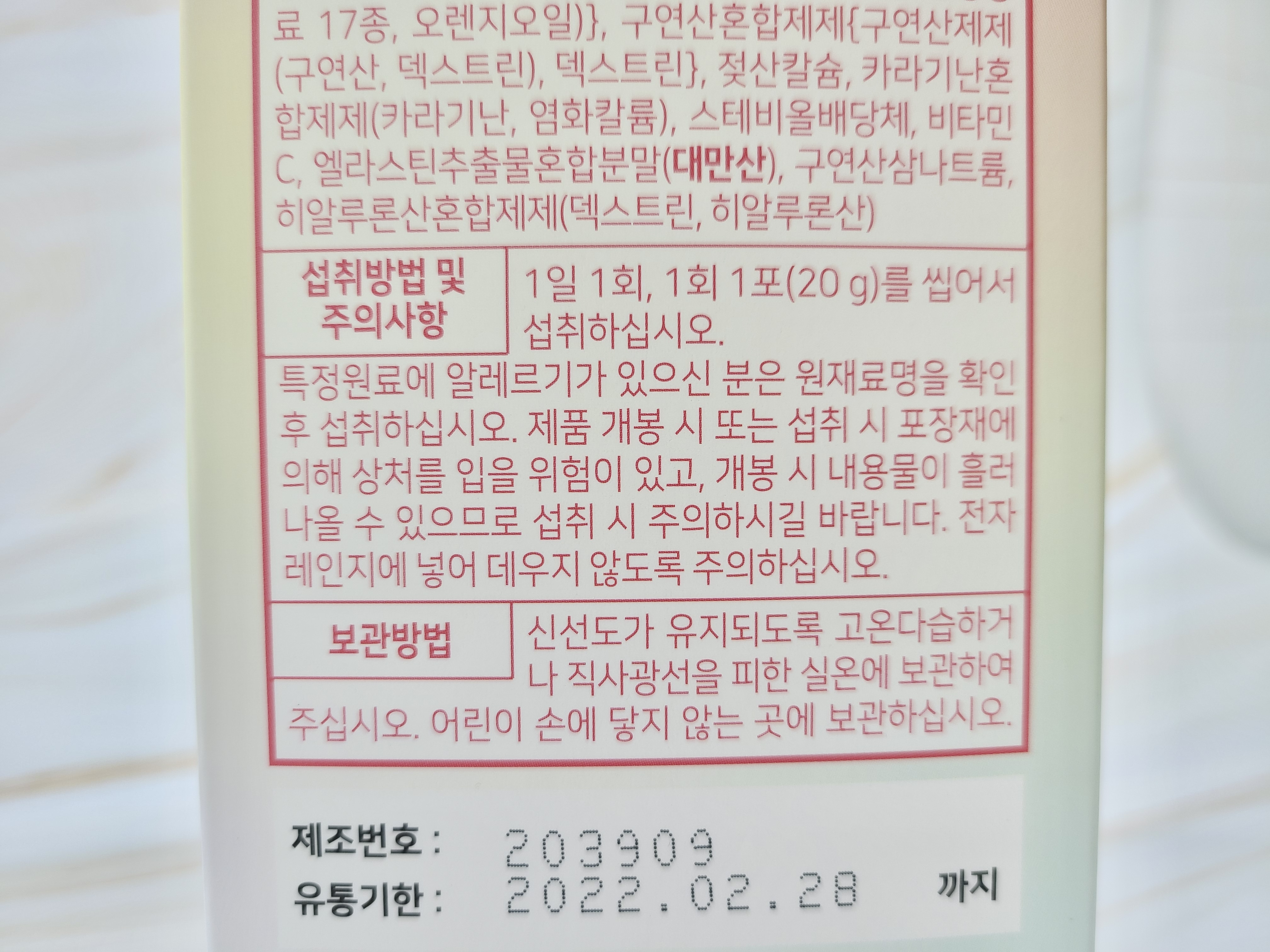 이 제품은 식품안전관리인증도 받은 제품으로 생선콜라겐이 7.5% (1500mg) 함유되어있는 제품이에요. 한상자에는 30포가 들어있어 한 달정도 먹을 수 있는 분량이랍니다.