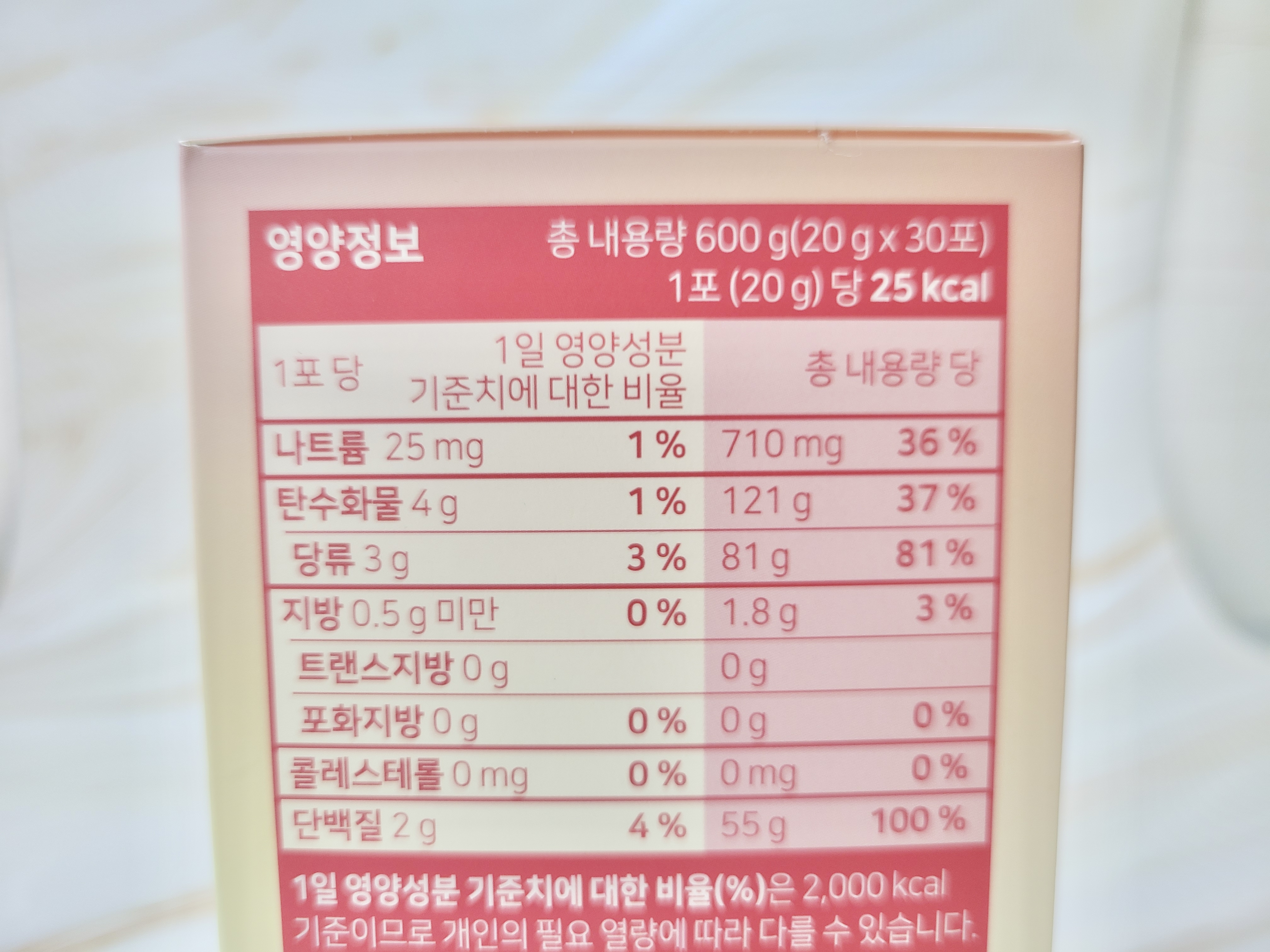 총 내용량 600g (20g x 30포) / 1포(20g) 당 25kcal