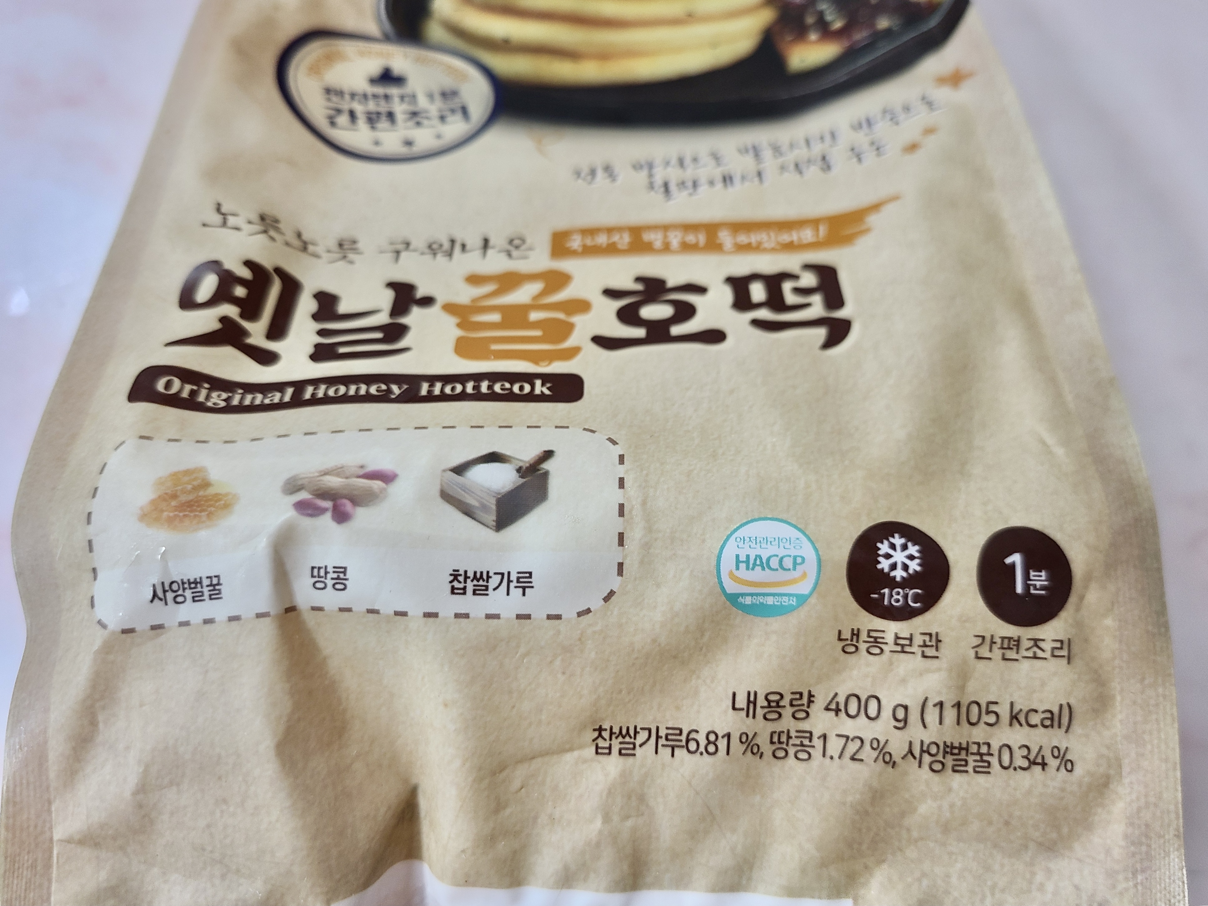 냉동보관 해주셔야 하구요. 구워져있는만큼 1분간 간편조리만 하면 옛날꿀호떡을 맛볼 수 있어요. 찹쌀가루 6.81%, 땅콩 1.72%, 사양벌꿀 0.34%가 함유되어 있습니다.