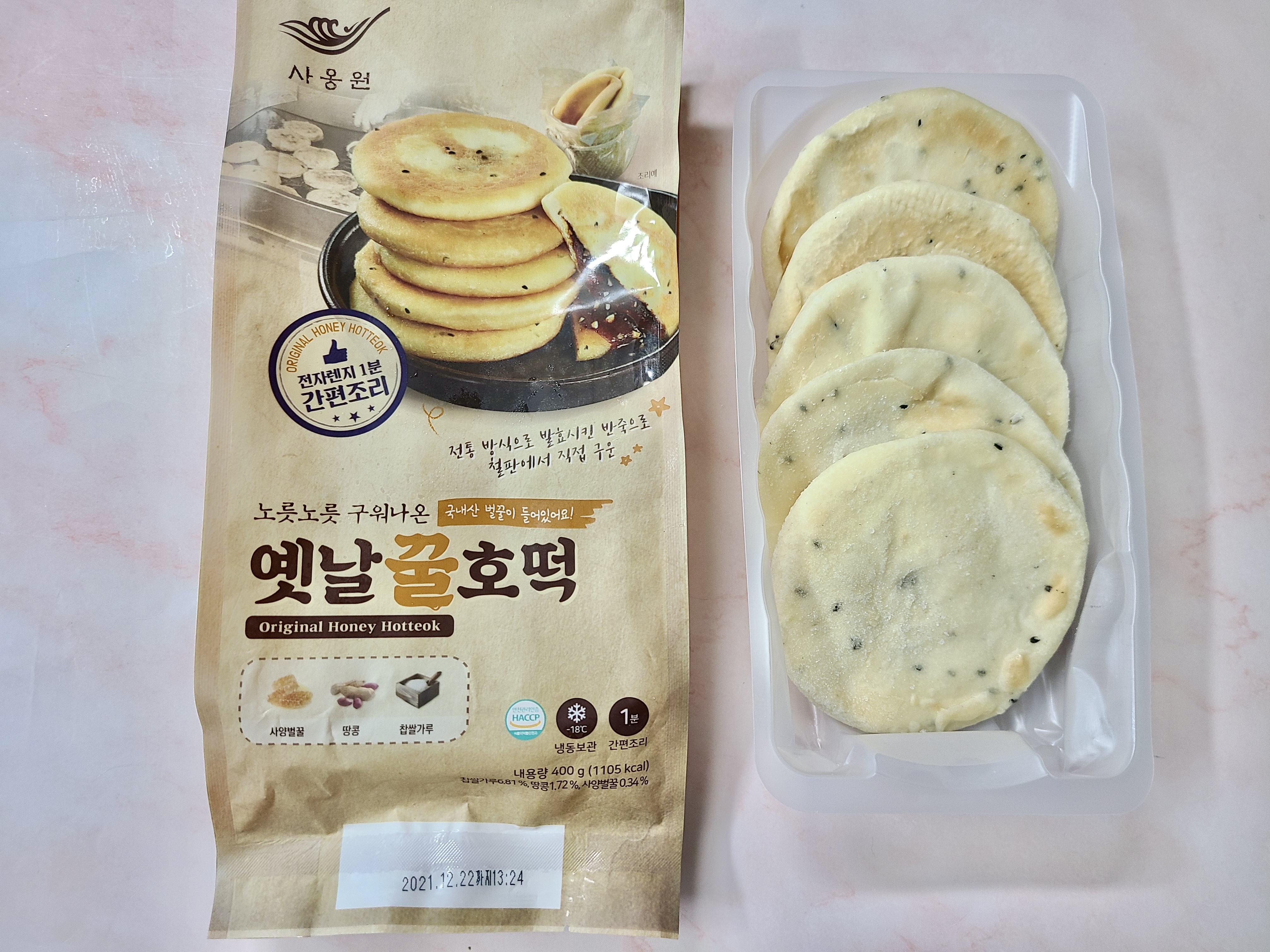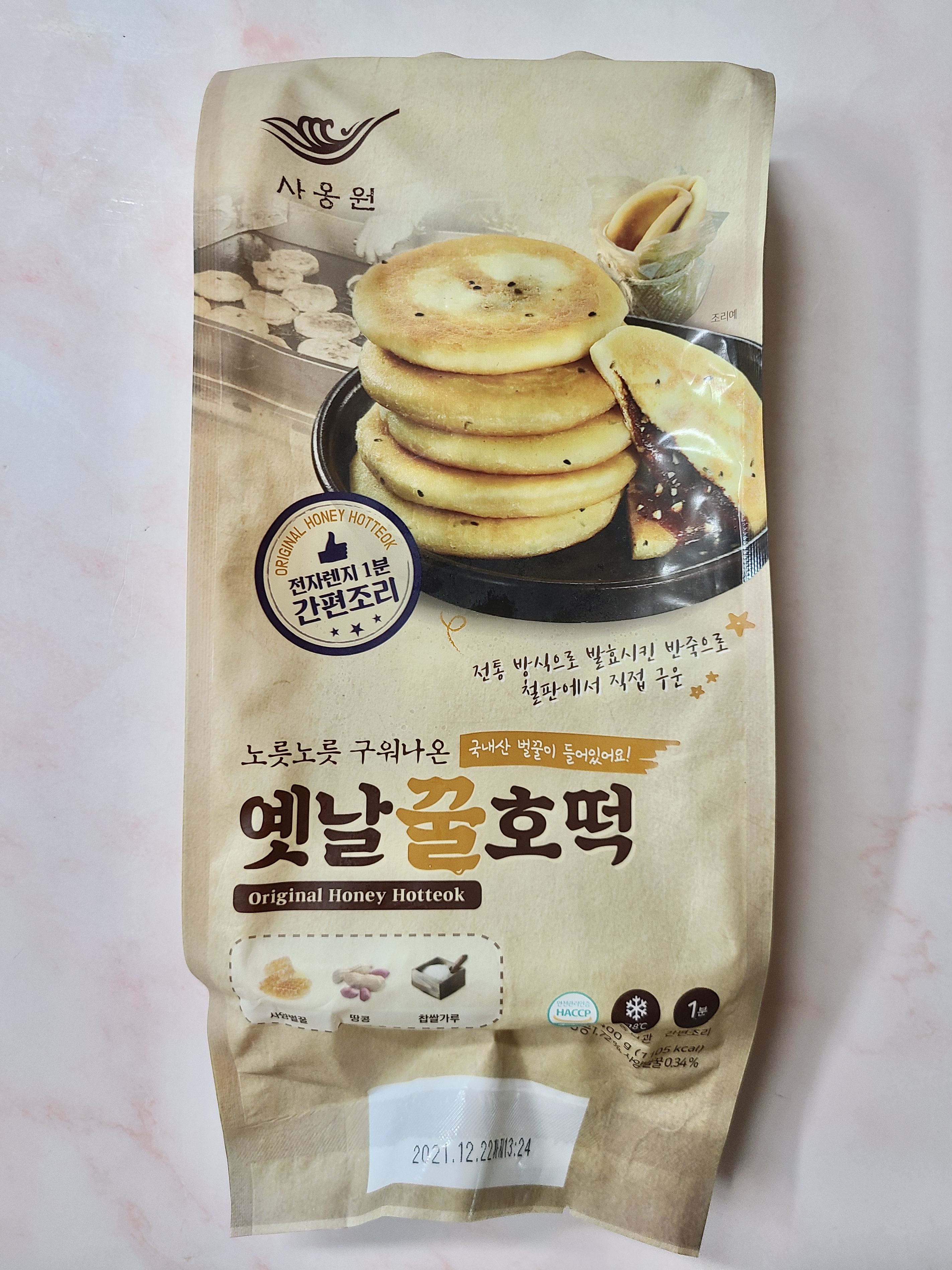 사옹원에서 나온 제품이구요. 노릇노릇 구워 나왔어요. 안에는 국내산 벌꿀이 들어있기 때문에 아이들에게 줄 건강한 간식으로도 좋다는거. 사양벌꿀, 땅콩, 찹쌀가루로 이루어진 제품이에요. 특히 전통방식으로 발효시킨 반죽으로 철판에서 직접 구워 맛없을 수가 없답니다.