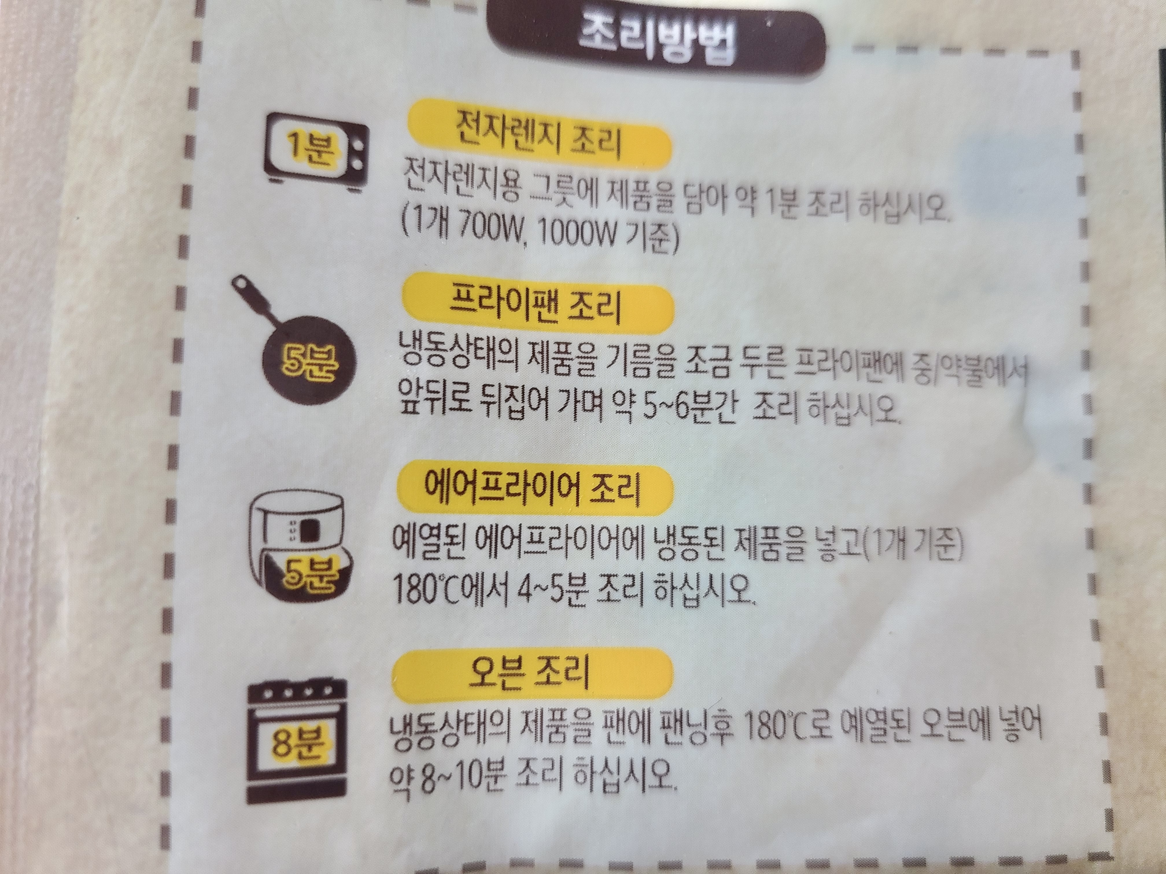 3. 에어프라이어 조리 : 예열된 에어프라이어에 냉동된 제품을 넣고(1개 기준) 180도에서 4~5분 조리 하세요.