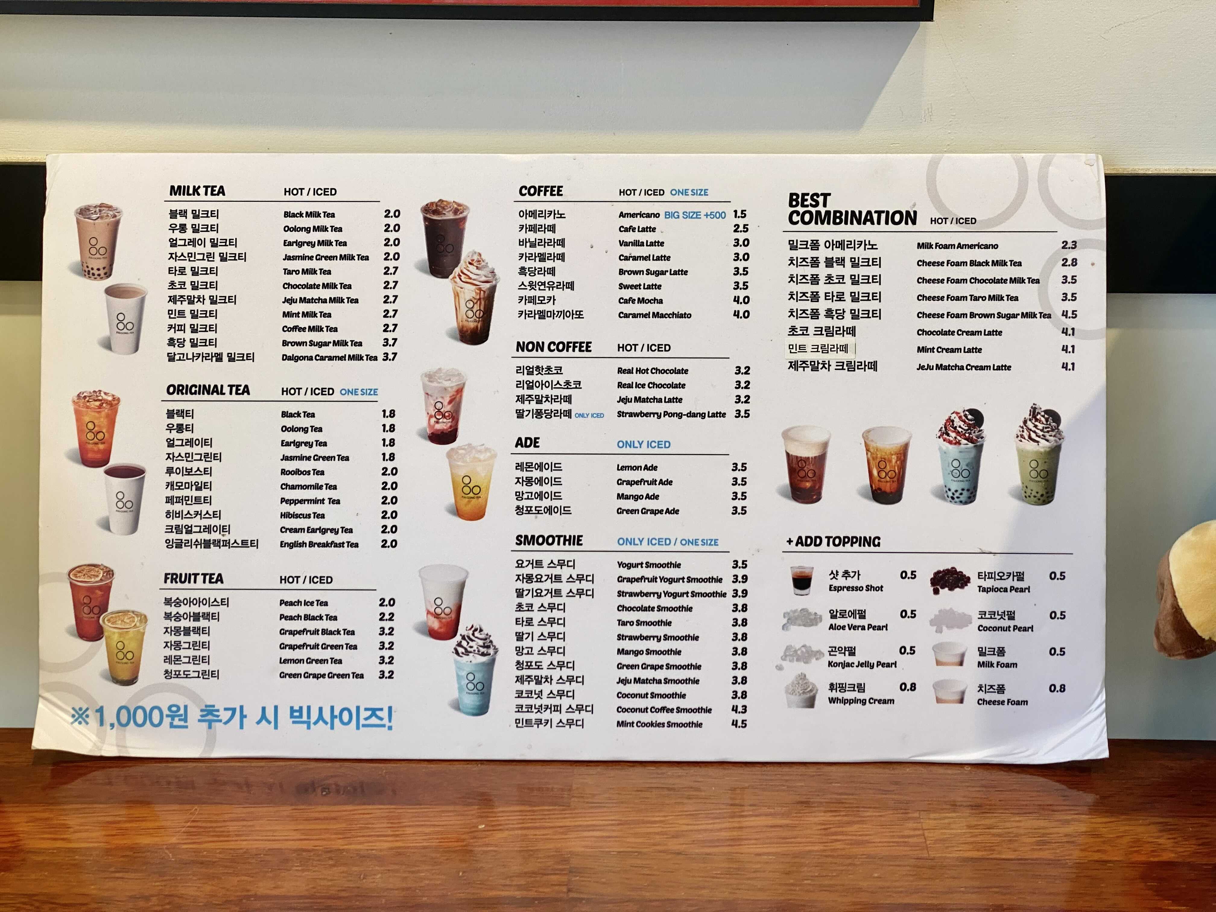 메뉴를 보면 다양한걸 알 수 있죠. 원래의 가격도 매우 착한데 1,000원을 추가하면 빅사이즈까지 받아볼 수 있어요. 추가하지 않고 기본 사이즈로 먹더라도 적당하기 때문에 따로 사이즈업을 한 적은 없는 거 같아요! 토핑도 가득이죠.