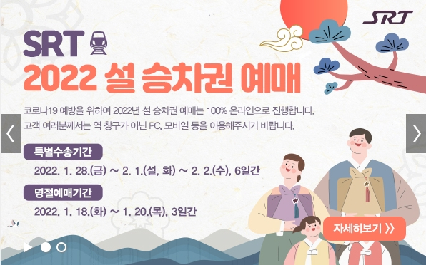 안녕하세요. 오늘은 다가오는 설 srt 예매 방법 알려드리려고 합니다. 설 승차권은 2022년 1월 18일부터 20일까지 사흘간 온라인과 전화 등 100% 비대면 방식으로 사전판매한다는데요. 어떻게 하면 되는지 자세한 방법 알려드리겠습니다.